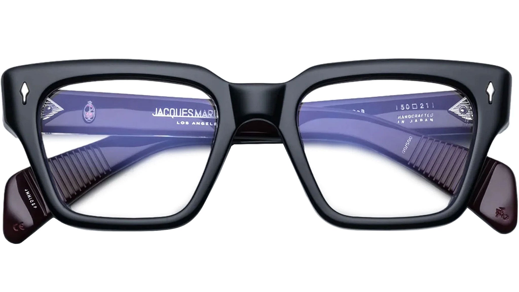 Curated 10mm black acetate frame. Custom double laminated acetate temples featuring precious metal hardware in sterling silver.
