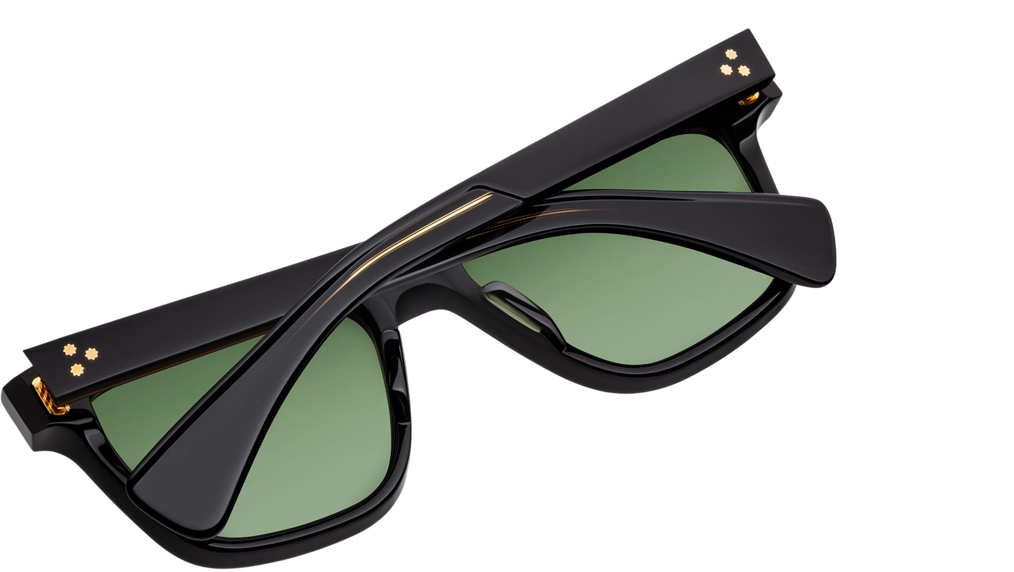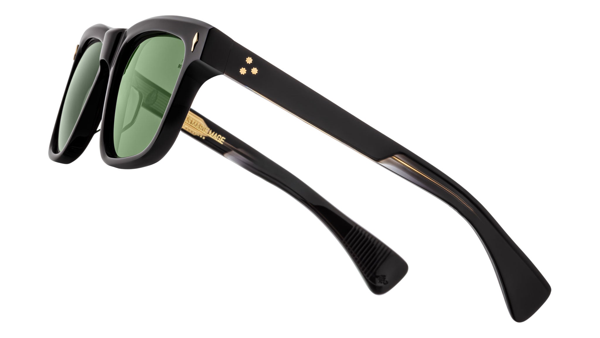 Black 10mm cellulose acetate frame with custom acetate temples featuring precious metal hardware and green CR-39 lenses, dark gold signature arrowhead front pin, inner dark gold wirecore, gold tension-secured custom 7-barrel hinge, gold domed 3D metal logo, emerald CR-39 6-base lenses with backside anti-reflective treatment.