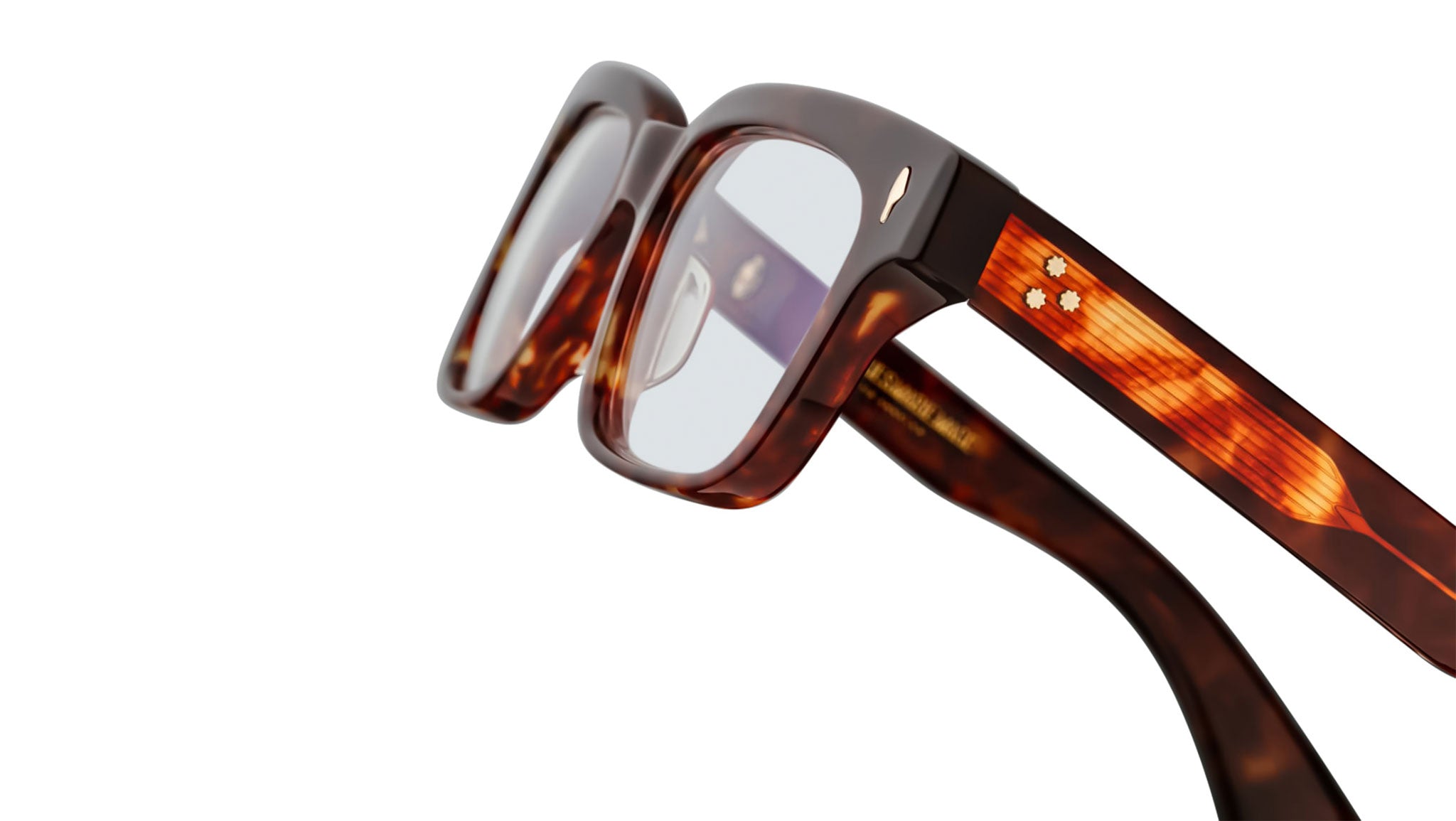 LIMITED PRODUCTION BATCH OF 450 PIECESBrown 10mm cured cellulose acetate frame with custom double-laminated acetate temples and demo lenses. Light gold signature arrowhead front pin, hidden light gold wirecore, and light gold tension-secured custom 5-barrel hinge with sterling dark gold spur-shaped rivets enhance the elegant design. Frame shape: rectangular.