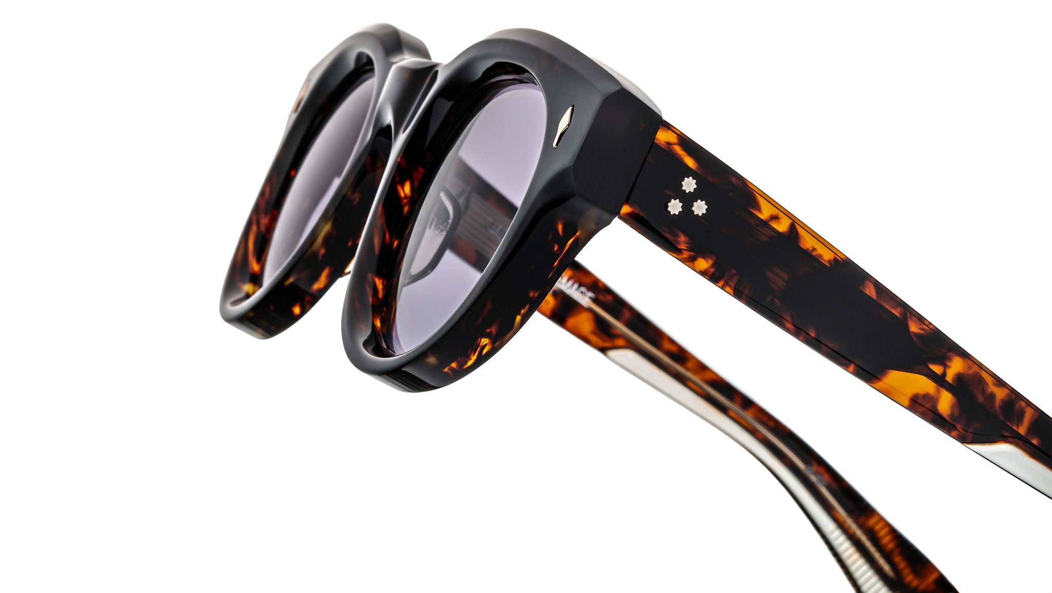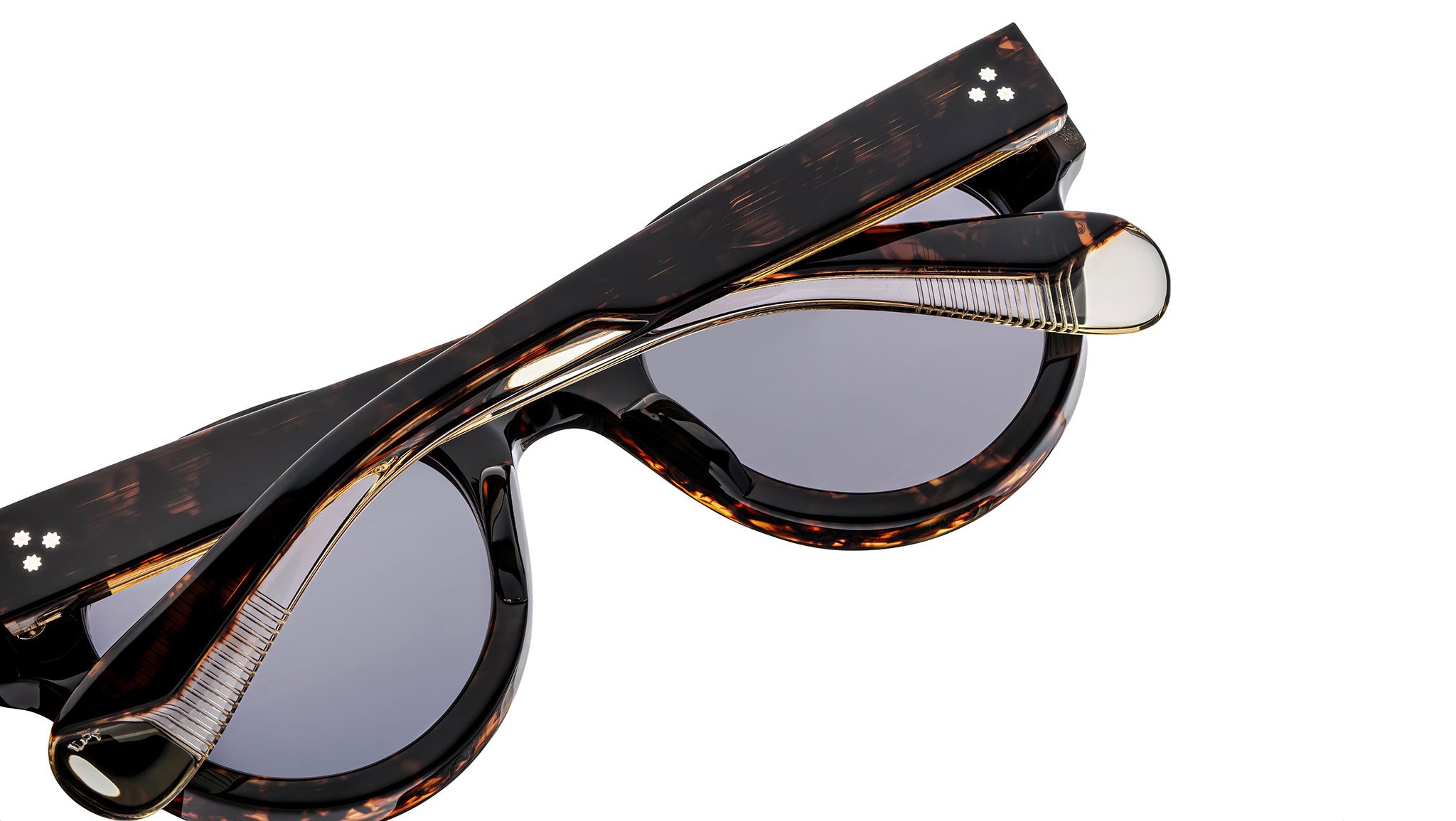 Crafted from 10mm Havana cured cellulose acetate, this frame features custom double-laminated acetate temples with precious metal hardware and blue lenses. It includes a light gold signature arrowhead front pin, hidden light gold 'Classic' wirecore, and light gold tension-secured custom 7-barrel hairline hinges. The Nimbus CR-39 6-base lenses are finished with a backside anti-reflective treatment.