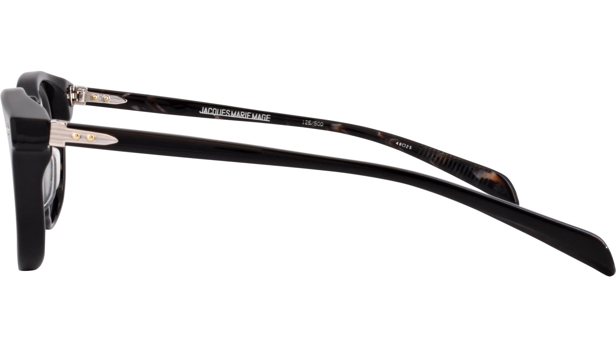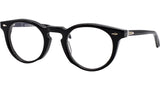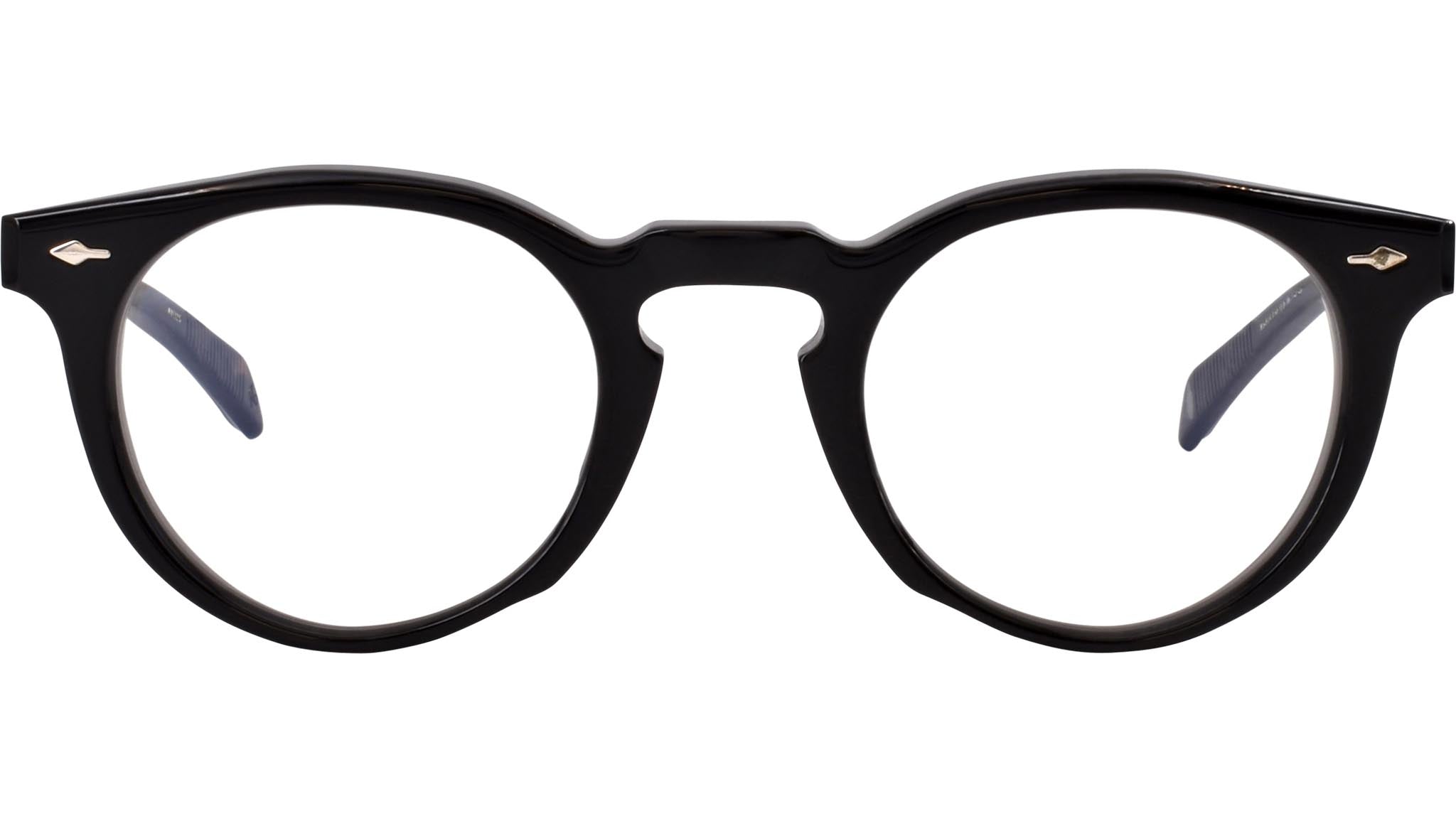 Open Ps lens shape with double-rivet hinge offering a generous fit. Cured 10mm polished black cellulose acetate frame, custom double laminated acetate temples ft. precious metal hardware in sterling silver. Demo lens. Sterling silver signature arrowhead front pin. Sterling silver signature arrowhead front pin. Silver custom hairline engraved wire core design. Silver tension-secured custom hinge with spur-shaped rivets. Burgundy domed 3D metal cameo logo.