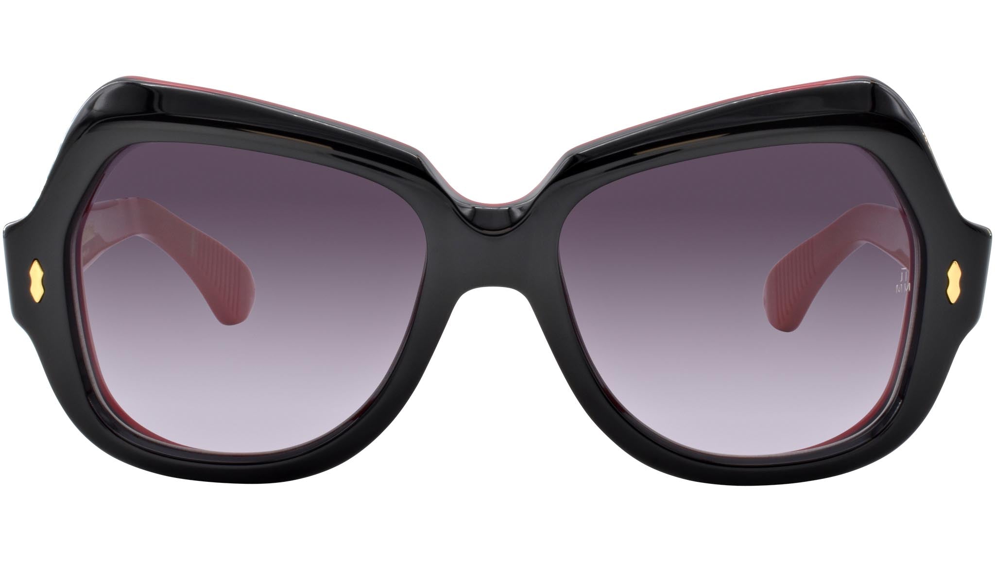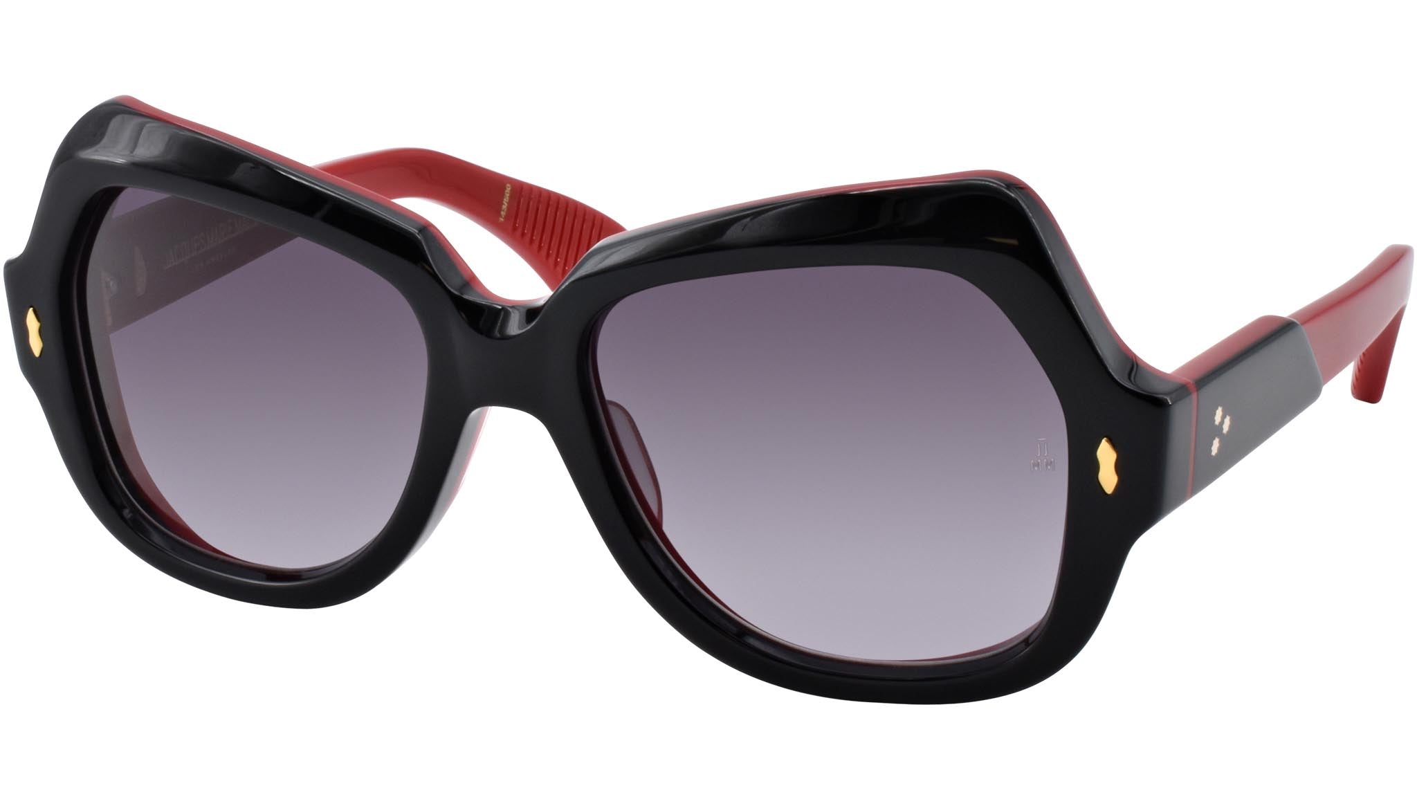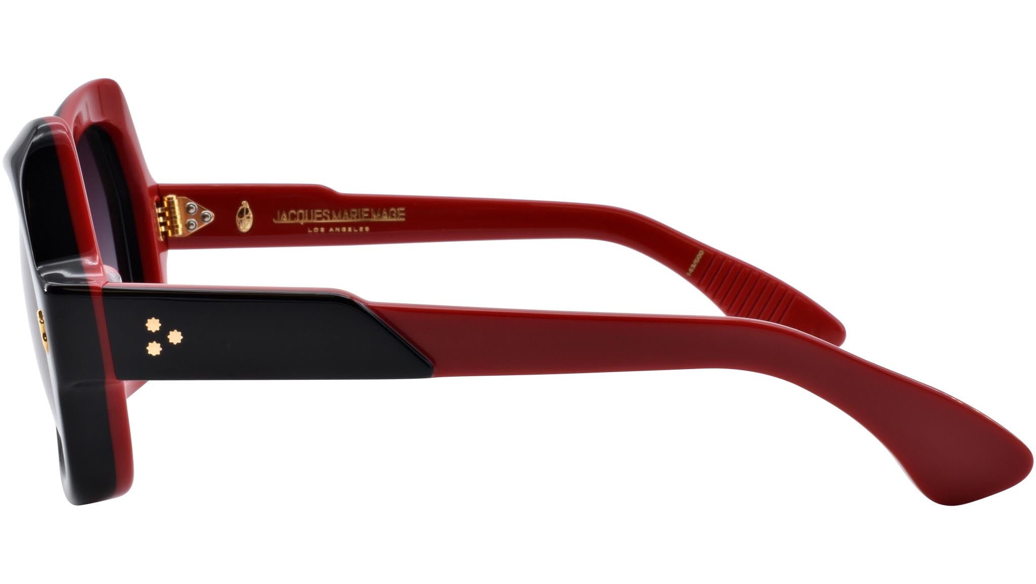Black 10mm cured cellulose acetate, with custom double laminated acetate temples and precious metal hardware. Fitted with black gradient lenses for a cohesive look. Dark gold double arrowhead front pin, an exposed dark gold wire core intricately engraved, and a dark gold tension-secured custom 7-barrel hinge that enhances its sturdiness. The black gradient CR-39 lenses are another significant detail. They are designed as a 6 base lens and are treated with a backside anti-reflective layer for improved visibility and eye comfort. The Jacques Marie Mage Perreti sunglasses exemplify a harmonious blend of artistic design and functional prowess.