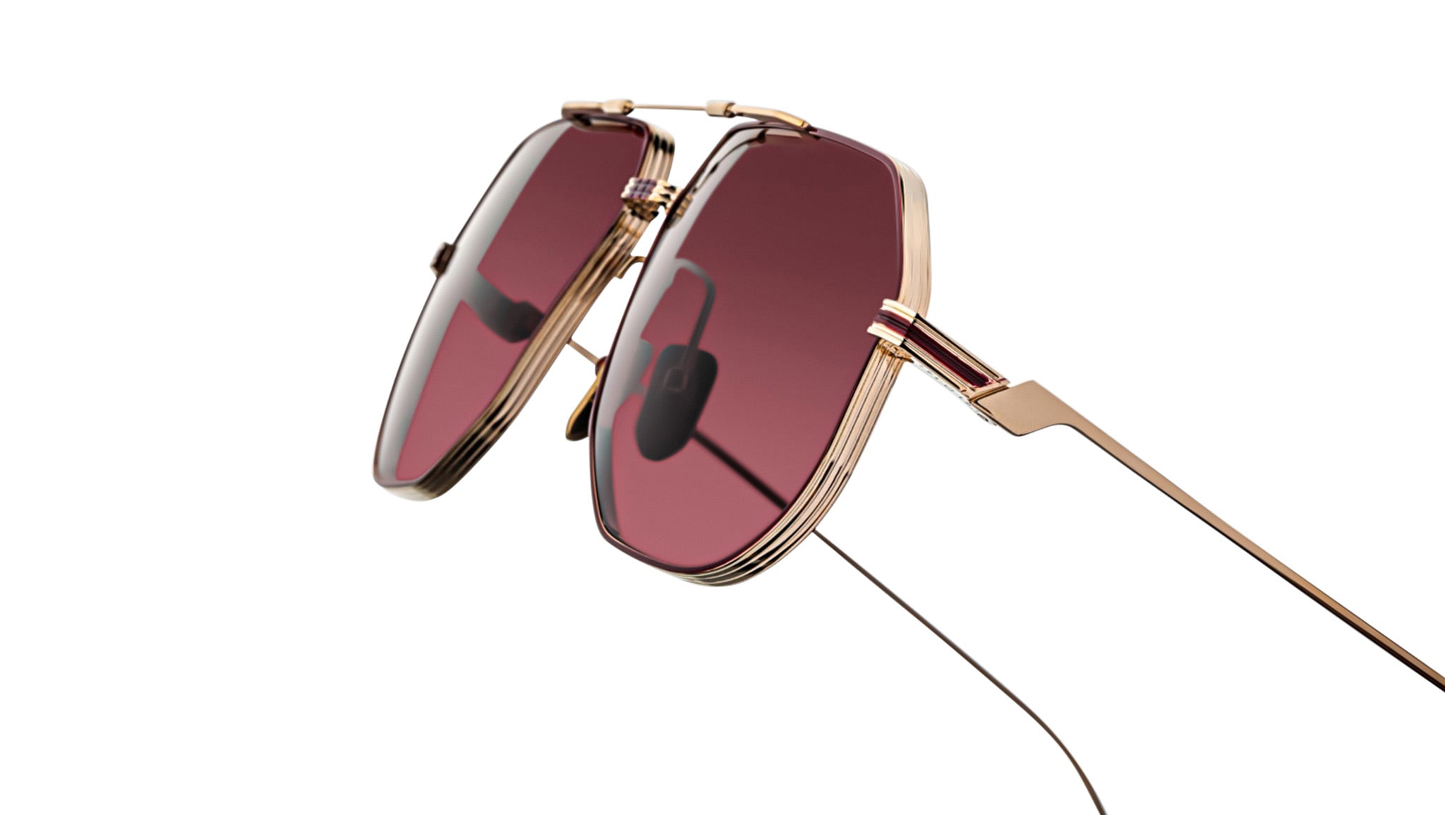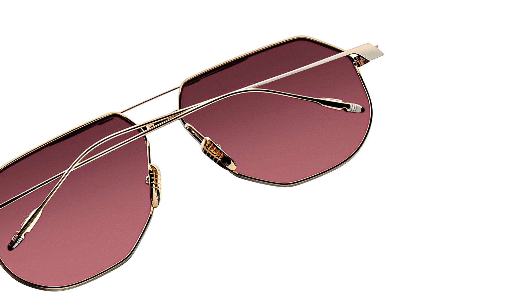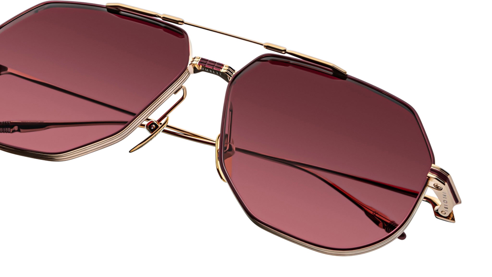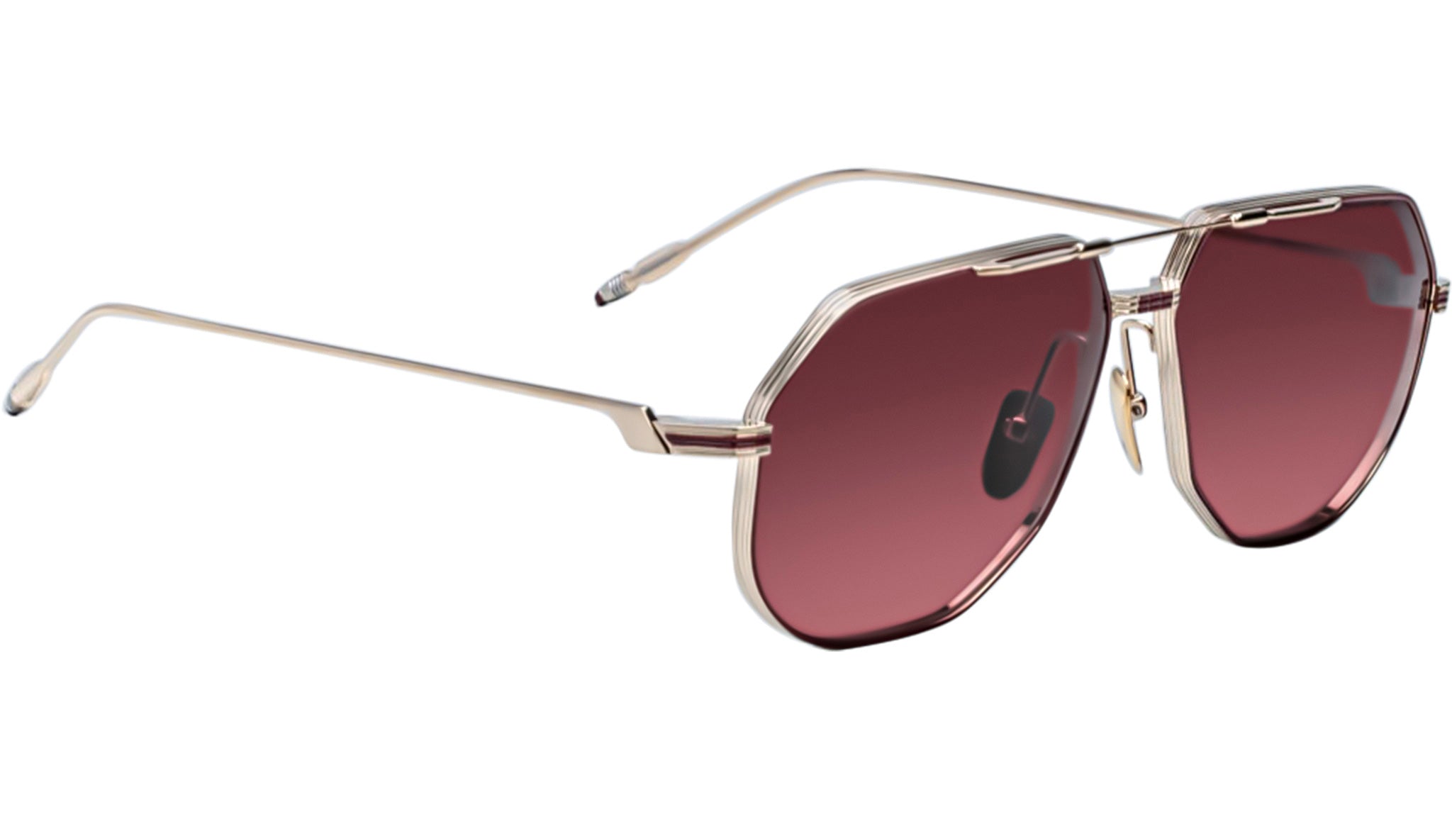 Light gold and burgundy 100% beta titanium frame with brown lenses. Features light gold and burgundy titanium wire temples with burgundy tailfin tips, a light gold tension-secured custom deco monoblock hinge, and custom nose pads with logo and hairline engraving. Mahogany CR-39 4 base lenses with backside anti-reflective treatment ensure optimal clarity and comfort. Frame shape: aviator. Provides 100% UV protection.