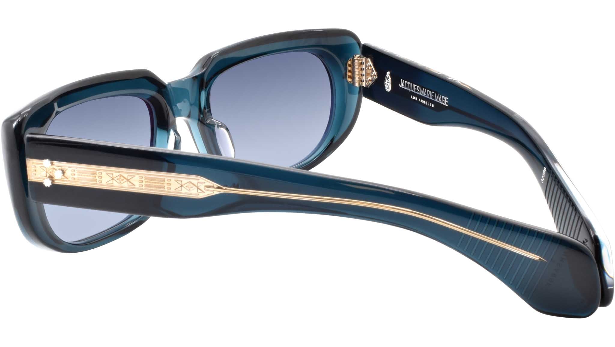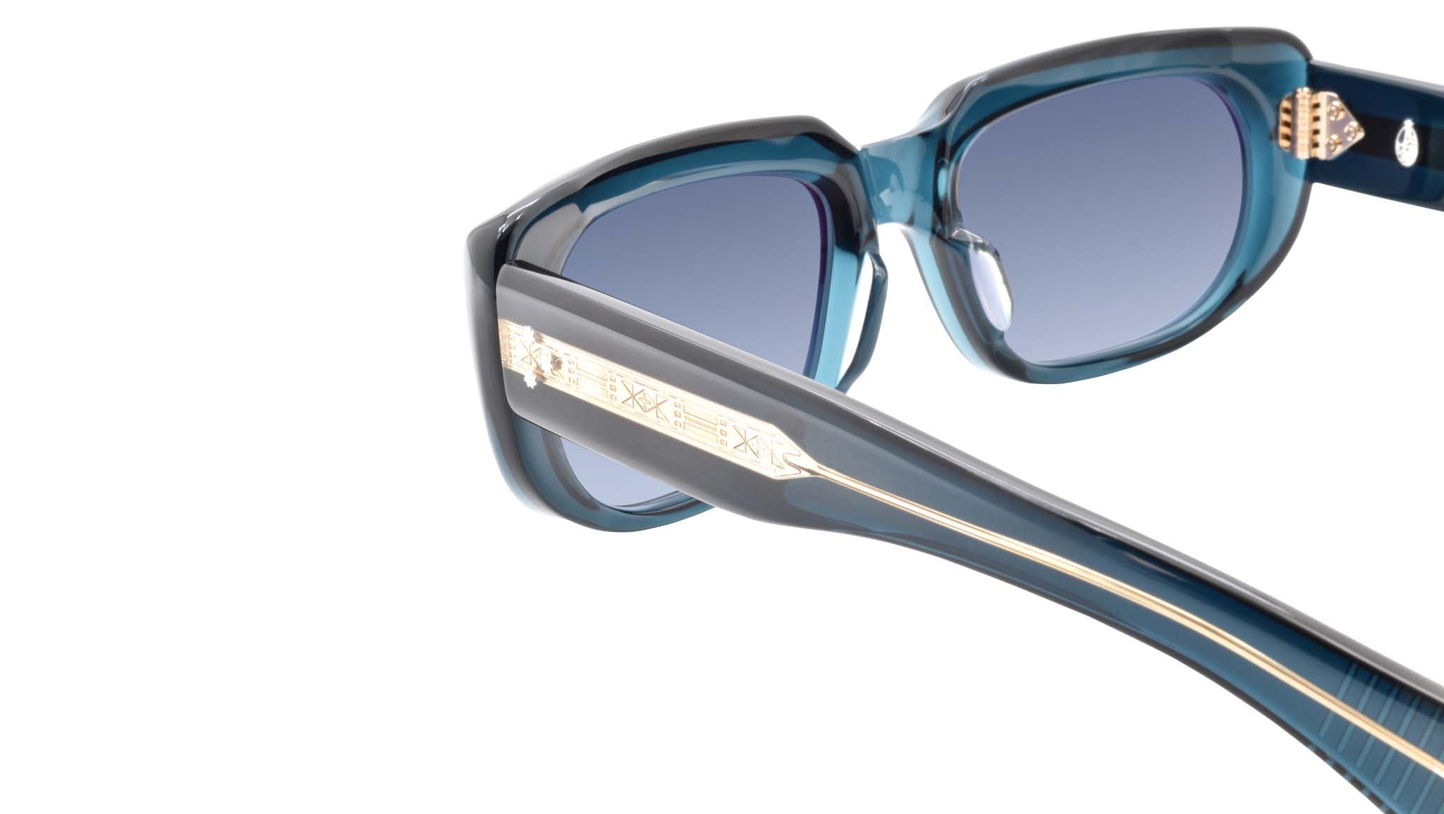 Indigo 10mm cured cellulose acetate frame with custom double laminated acetate temples, accentuated by precious metal hardware and blu gradient lenses. The inner light gold wire core exhibits custom native-inspired filigree engraving, while a light gold tension-secured custom 9-barrel hinge ensures durability. Adorned with blue 6 base CR-39 lenses featuring a backside anti-reflective treatment - a masterpiece of craftsmanship and style.