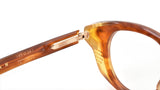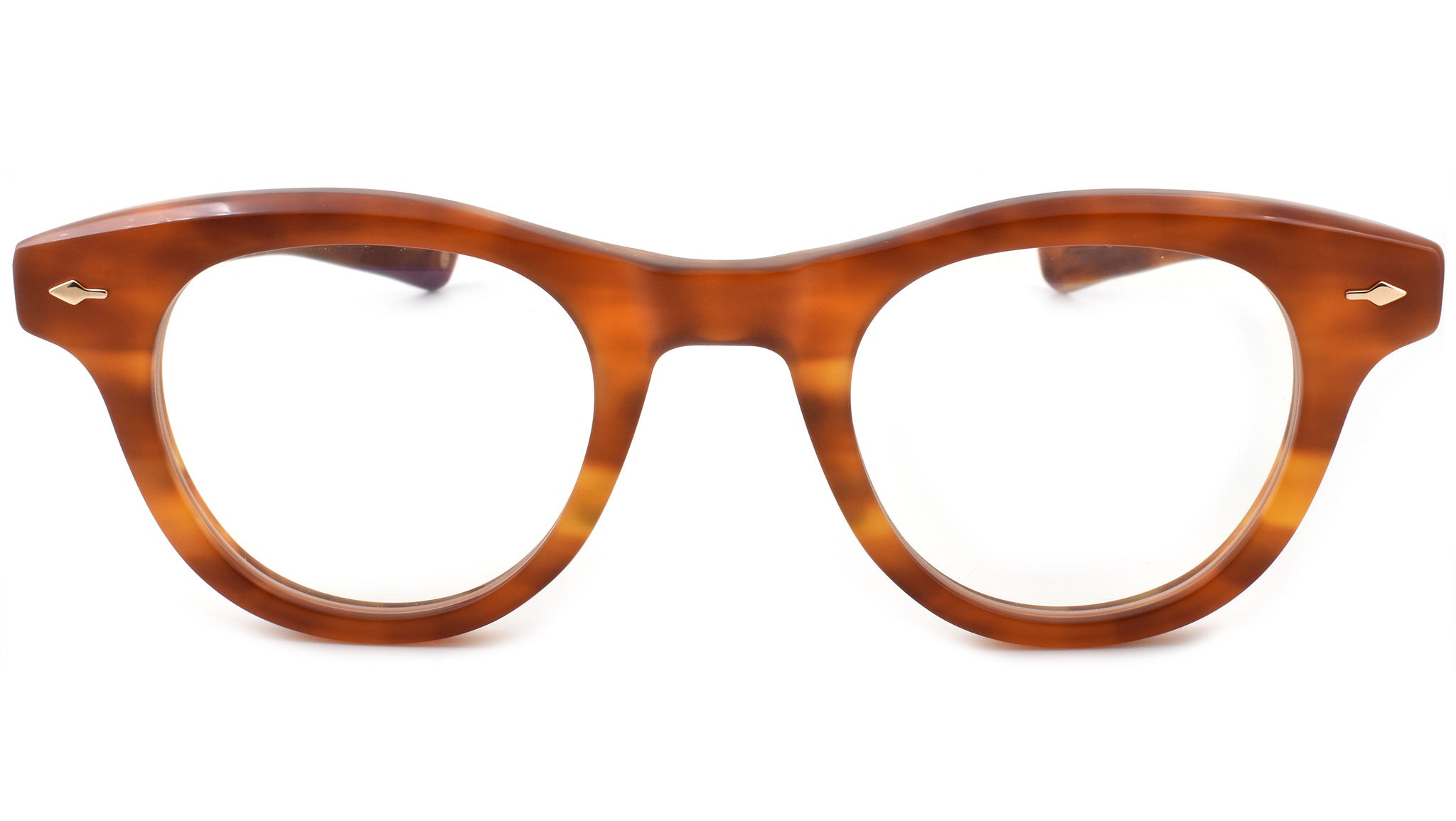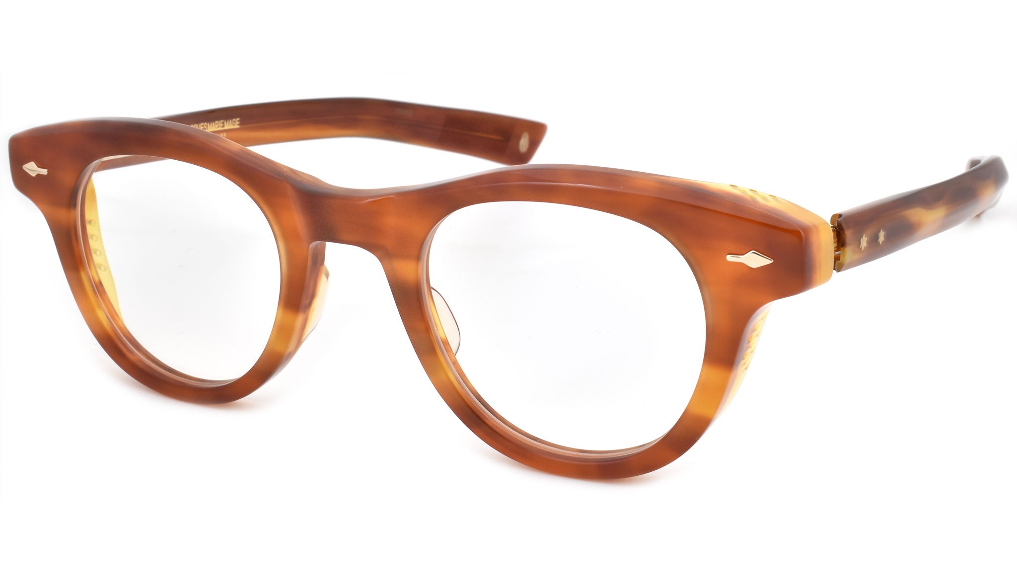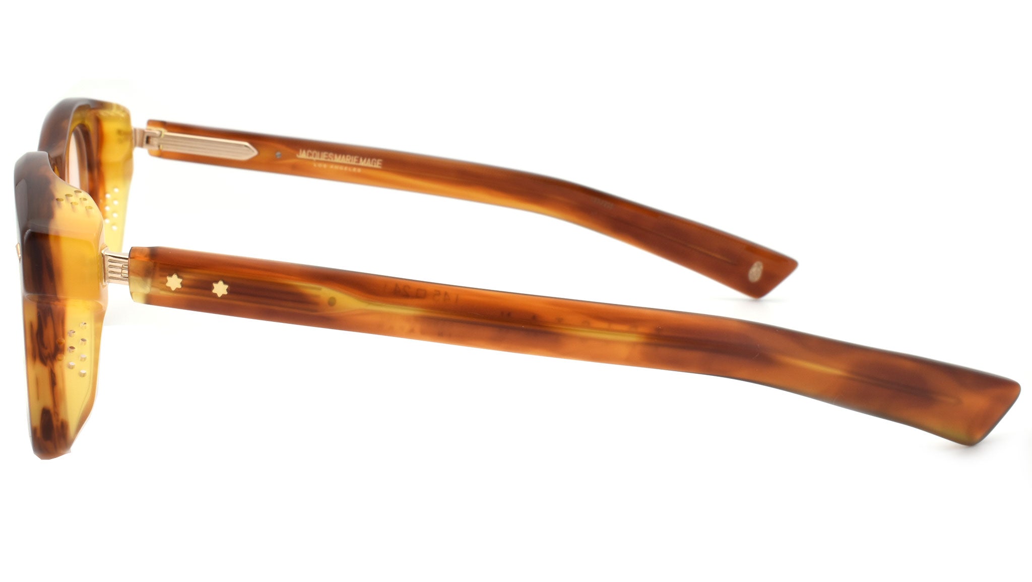 12mm block, striped havana polished inner matte outer acetate frame, custom floating hinge system. Hardware: light gold. Light gold signature arrowhead front pin. Light gold custom hairline engraved wire core design. Light gold custom floating hinge with spur-shaped rivets. Light gold domed 3d metal cameo logo. 6 base CR-39 demo lens with backside anti-reflective treatment. Handcrafted in Japan.