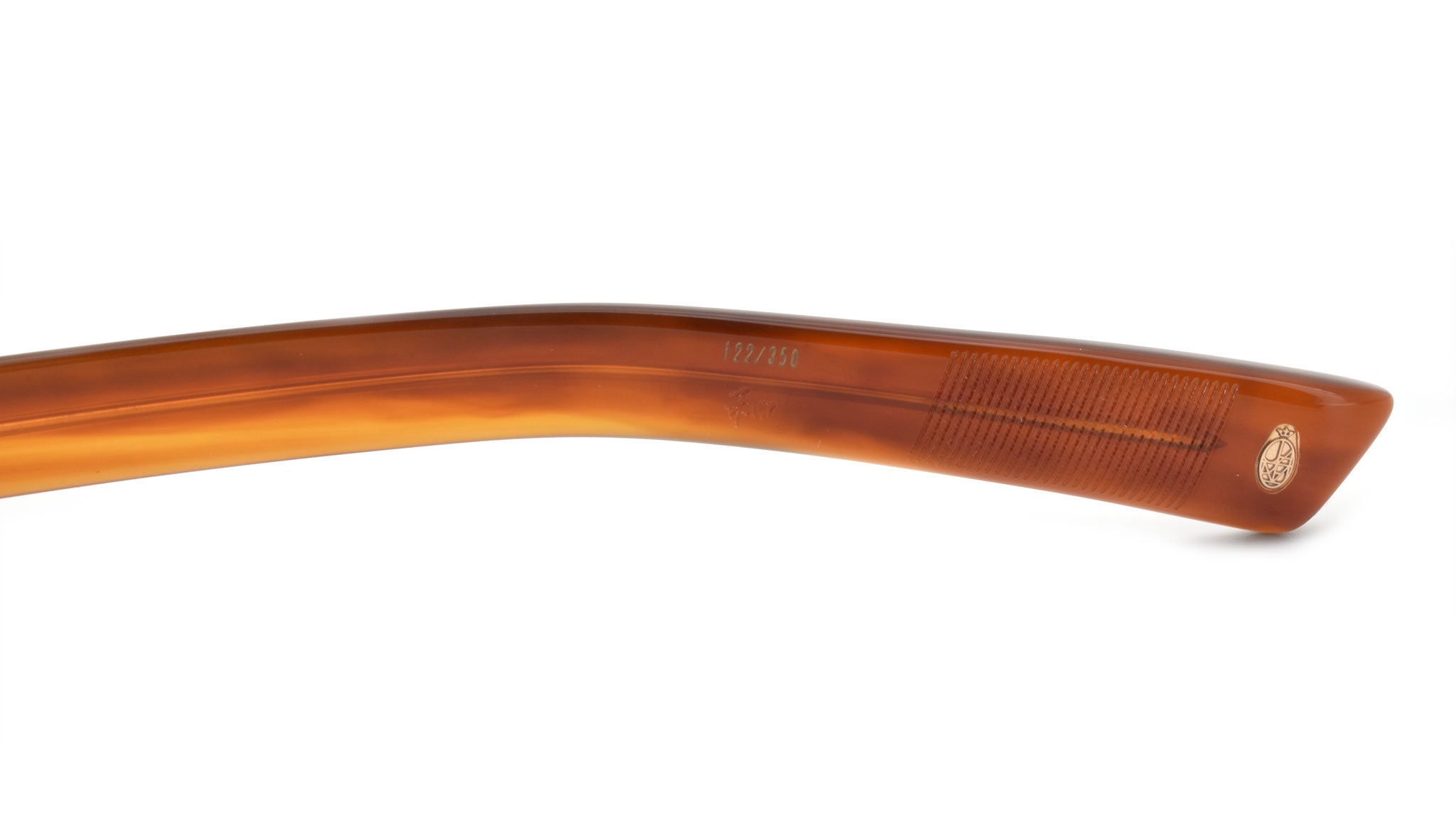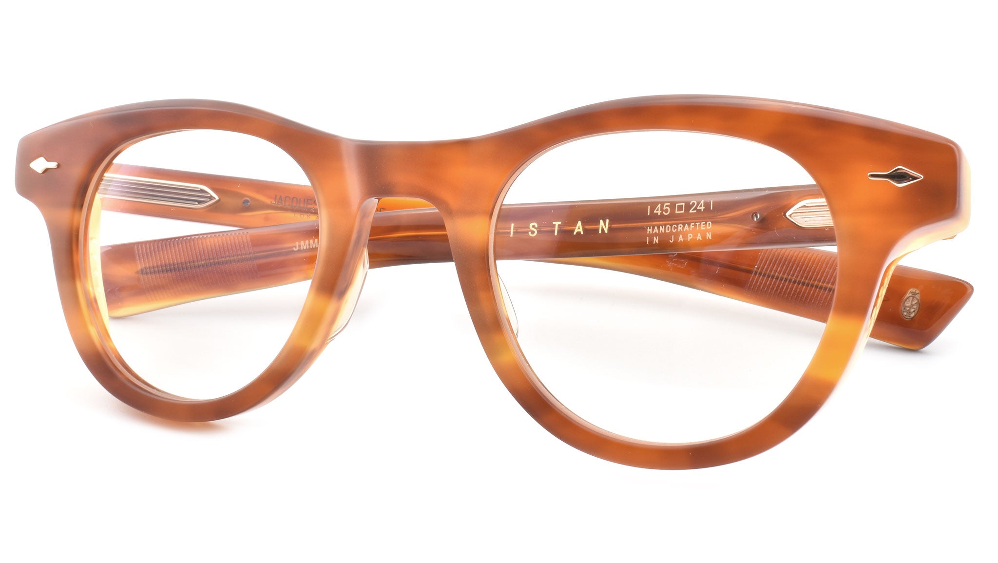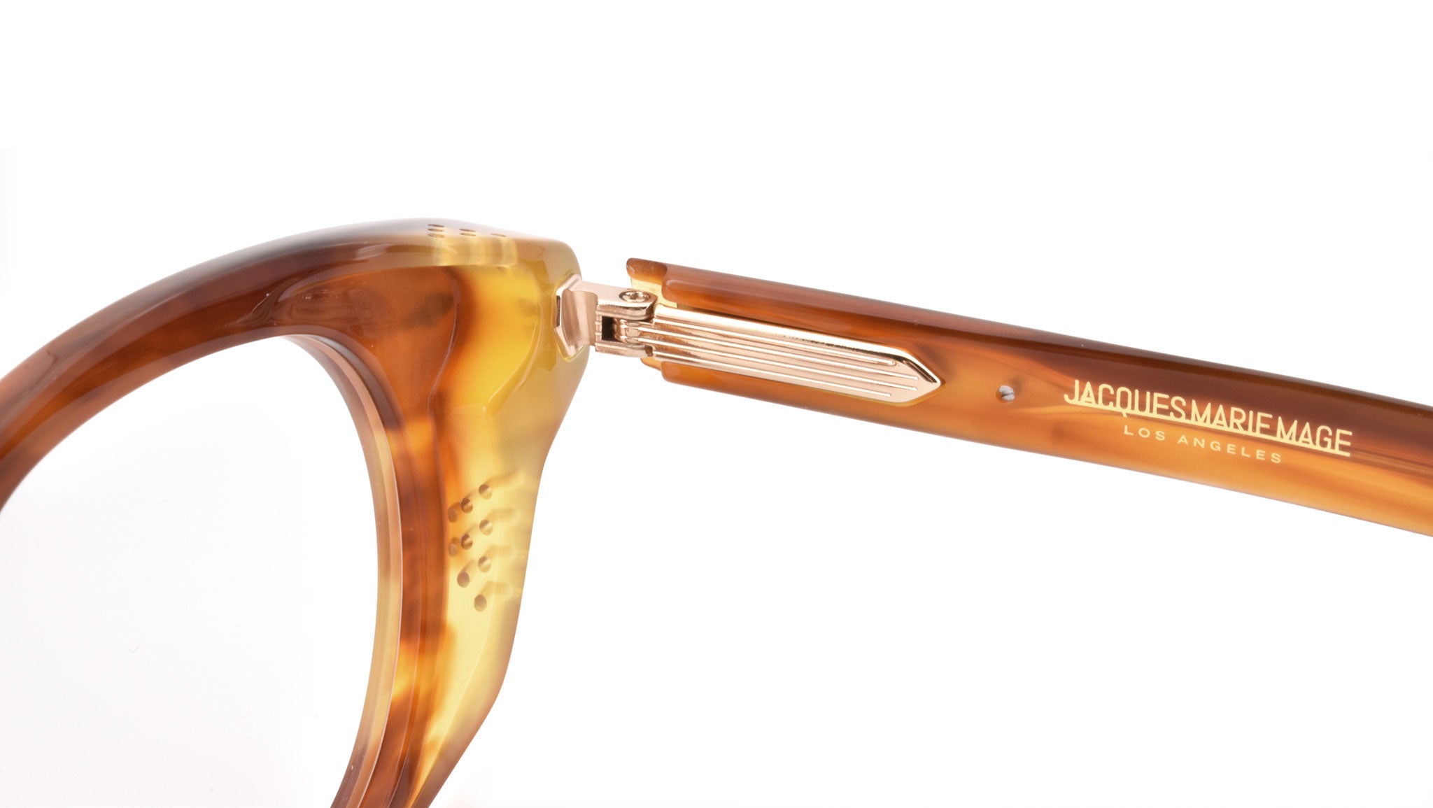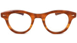 12mm block, striped havana polished inner matte outer acetate frame, custom floating hinge system. Hardware: light gold. Light gold signature arrowhead front pin. Light gold custom hairline engraved wire core design. Light gold custom floating hinge with spur-shaped rivets. Light gold domed 3d metal cameo logo. 6 base CR-39 demo lens with backside anti-reflective treatment. Handcrafted in Japan.
