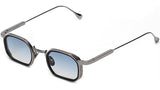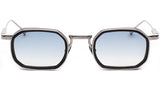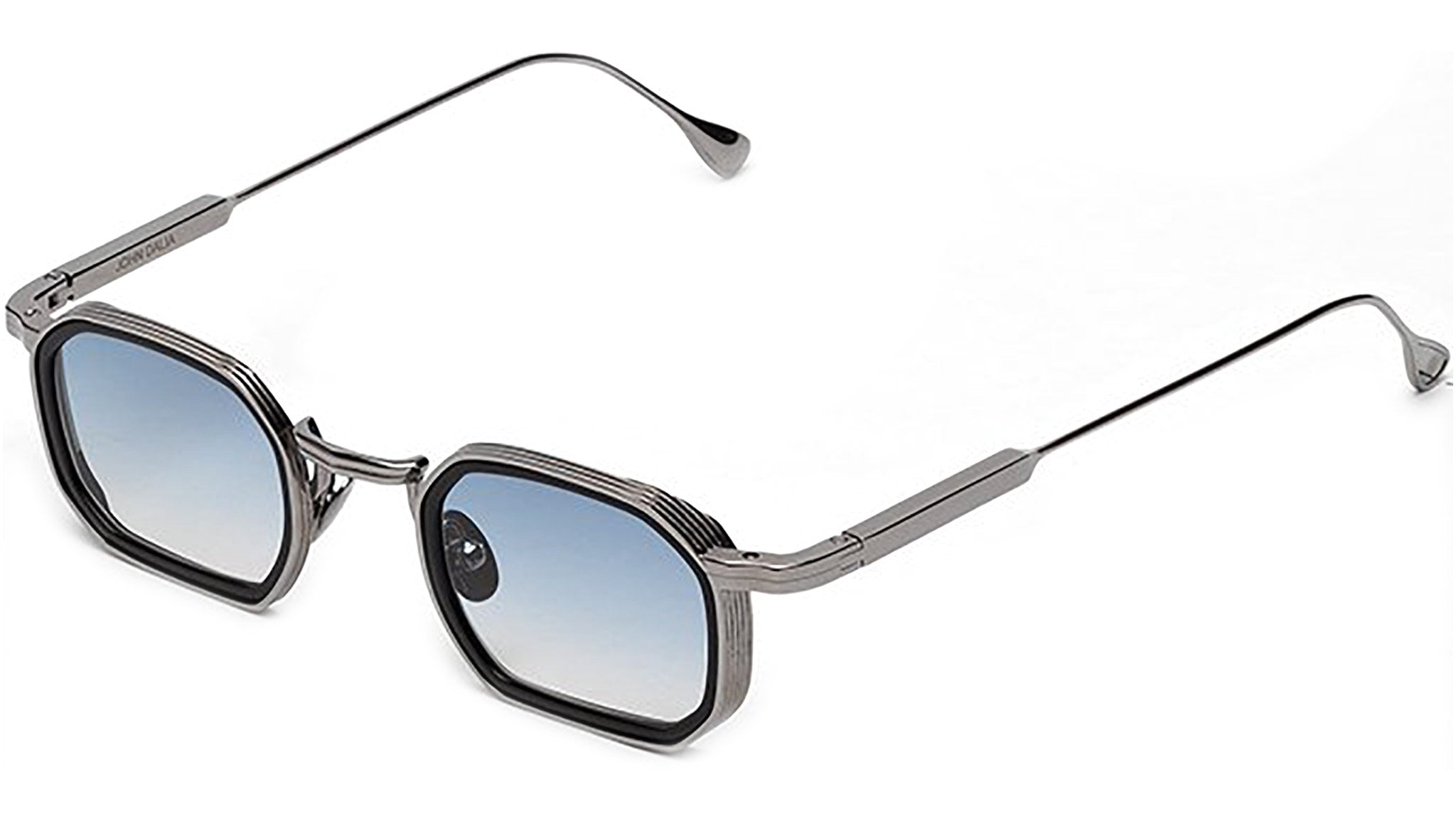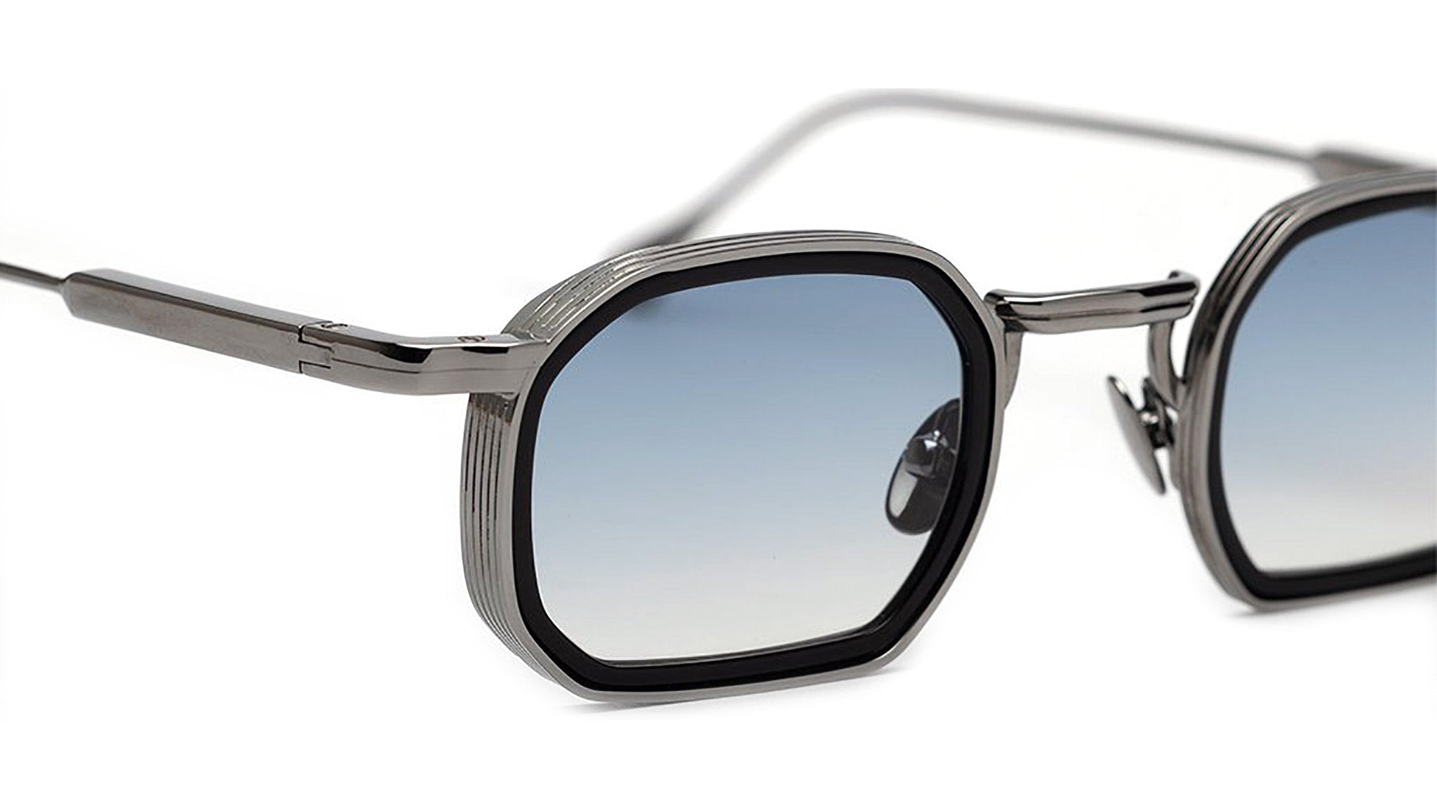 A square shape with rims carved out of a 8mm engraved metal strip. The frame is enlivened by a new geometric bridge and features traditional end pieces. Custom Infinite Black acetate & ruthenium plated alloy frame (c. 3µ layer). Clear Blue gradient CR39 lenses with AR treatment. Case and cleaning cloth are included.