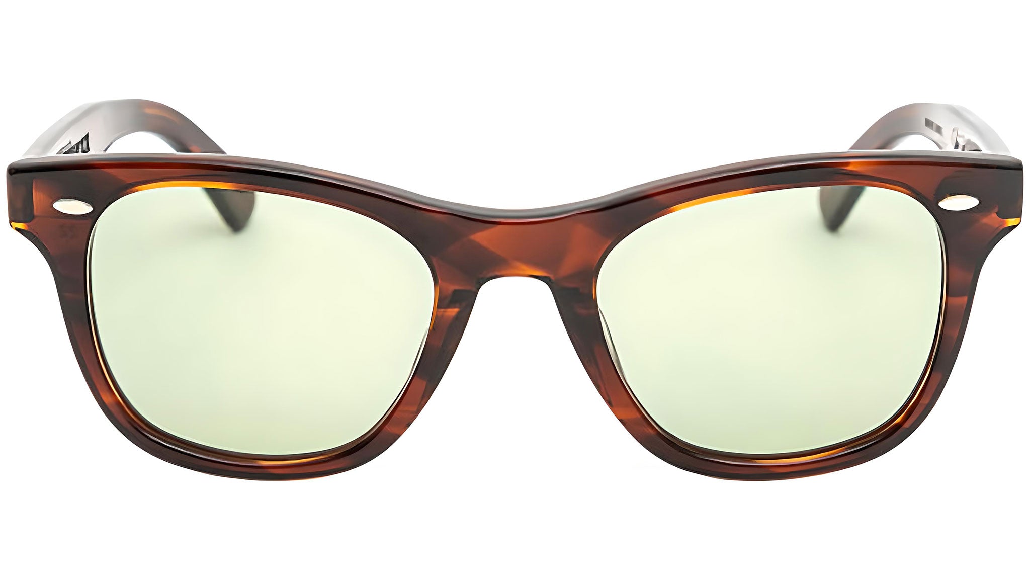 The Julius Tart Seafare sunglasses are distinguished by their crafted curves and smooth, polished finish. They feature a square-shaped frame made from black acetate and are equipped with green lenses. The design includes a gently sloped bridge and wide arms with oval temple accents, adding architectural depth to their timeless appearance. These sunglasses come in various colors including Black, Black Fade, Brown Crystal, Grey Crystal, Light Tortoise, Tortoise, Champagne, and Demi Amber, with dimensions of 51mm lens width, 22mm bridge width, and 145mm temple length. Each pair is delivered with official Julius Tart Optical packaging, a certificate of authenticity and warranty.