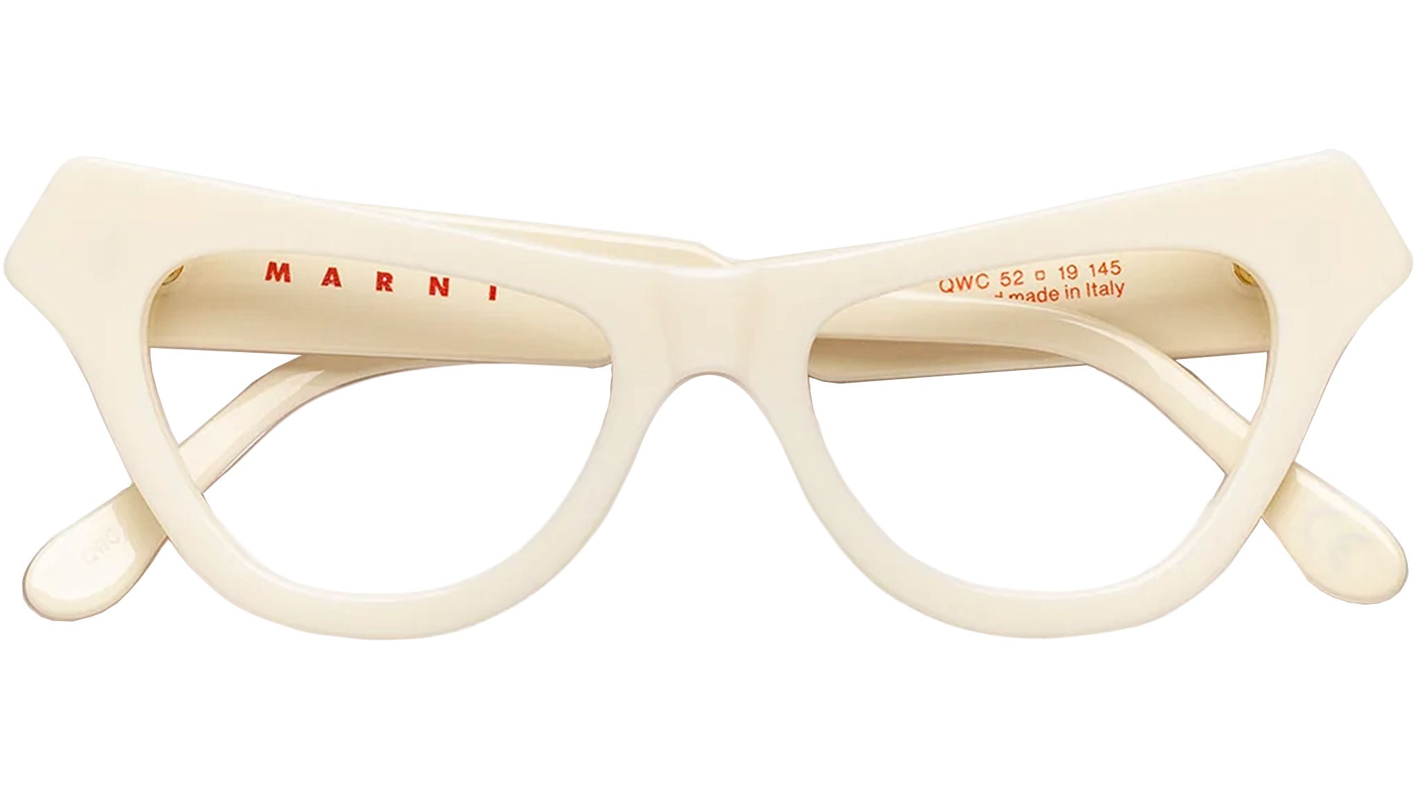Designed exclusively for Marni, Jeju Island is a bold Optical frame characterized by a chunky acetate construction and sculpted rims. The model is a unique reinterpretation of cat-eye shapes, with triangular lenses and a pointed front. The unique v-shaped browline is matched by softly curved lenses. This version features a solid-white acetate.