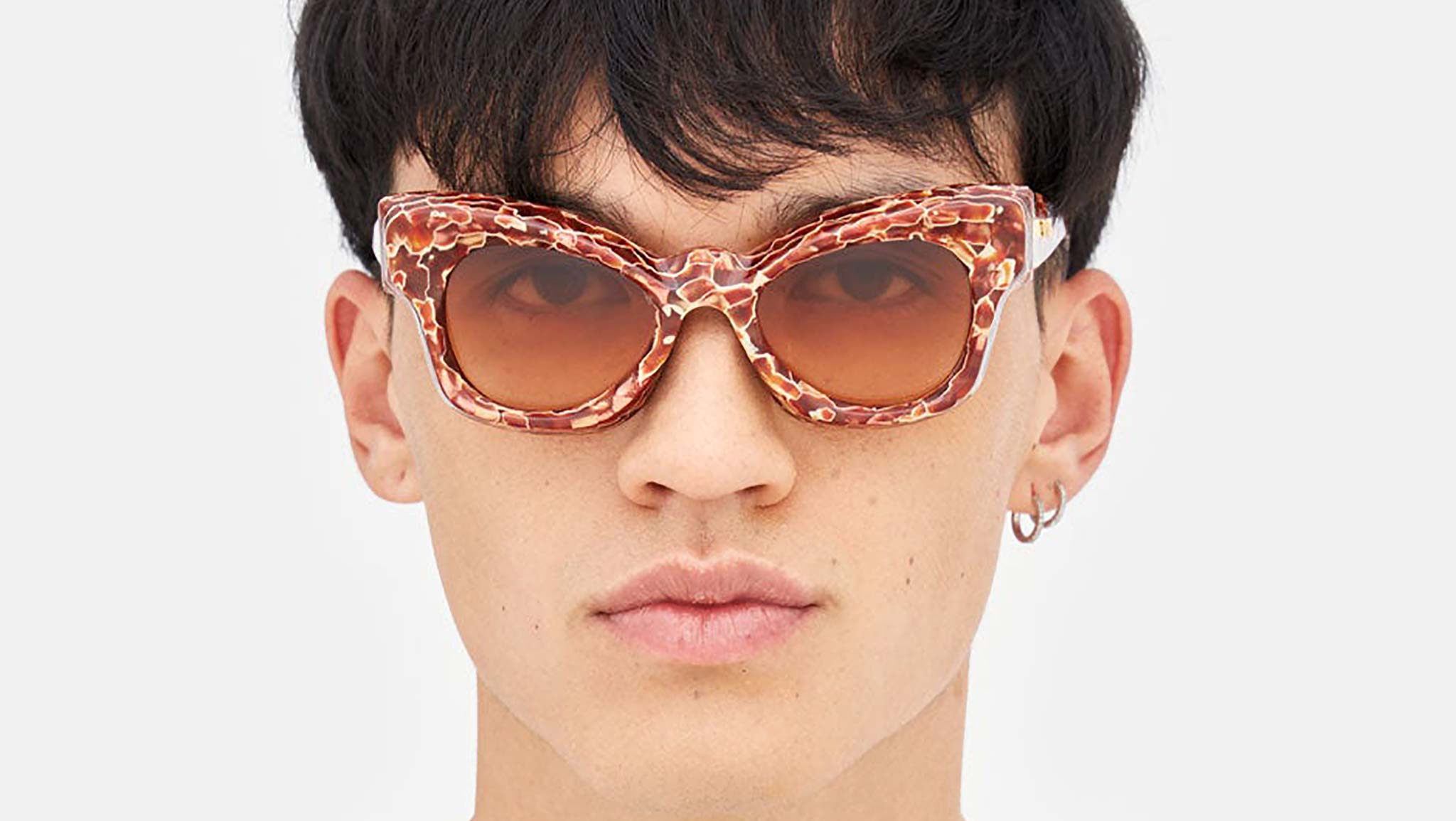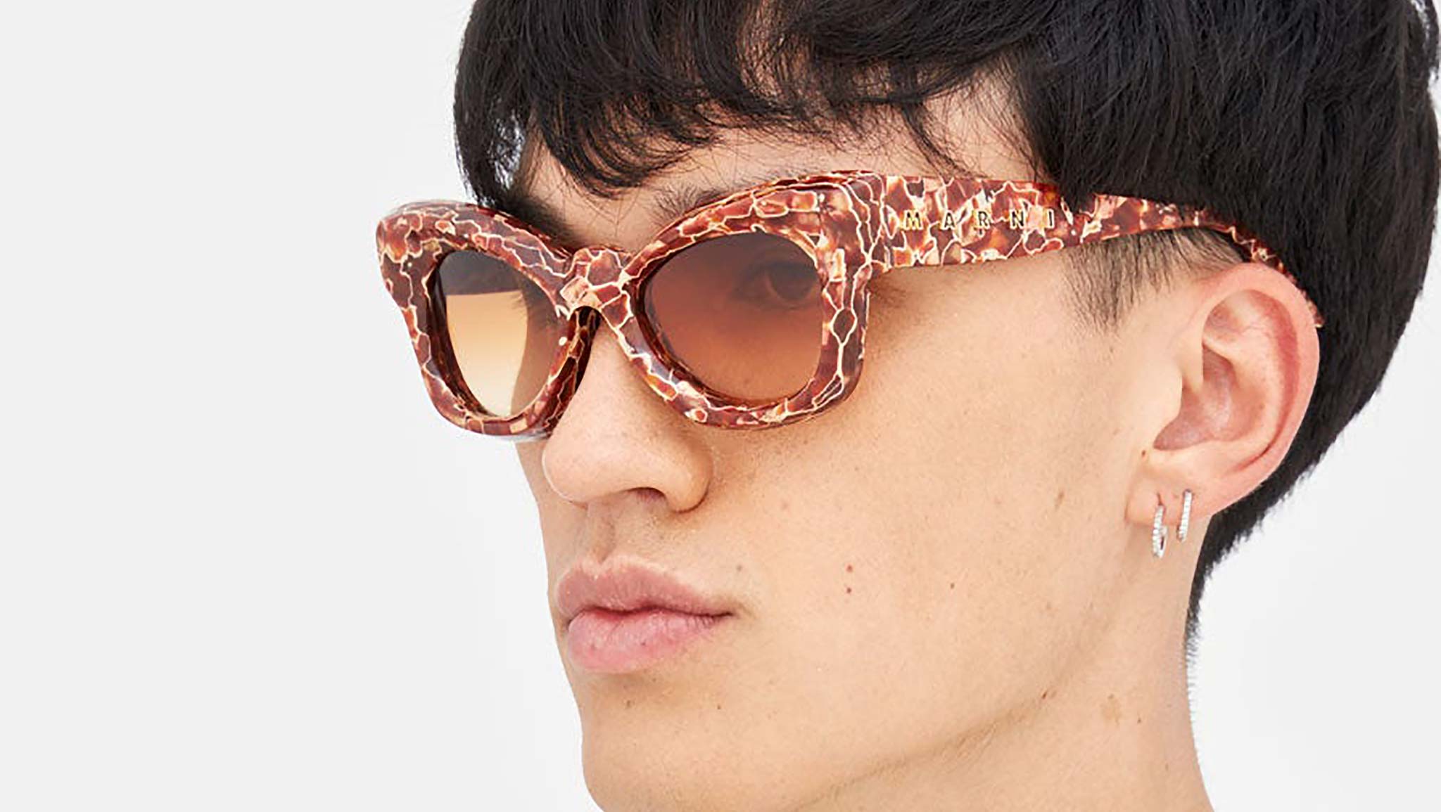 Designed exclusively for Marni, Magneticus is a bold contemporary silhouette featuring an intellectual character with a naughty twist. Its broad frontal piece is characterized by a butterfly shaped frame with chunky acetate construction and a low nose-bridge. Thick temples with bifurcated tips carry the distinctive Marni logo. This version comes in an exclusive lava-esque acetate, re-created exclusively for this season’s collection, matched with fading tinted lenses. Sizes: R / R. Lens Width: 50 mm. Frame Front: Frame Side: 145 mm. Product Code Size R: 0ZE. Product Code Size R: LF7.