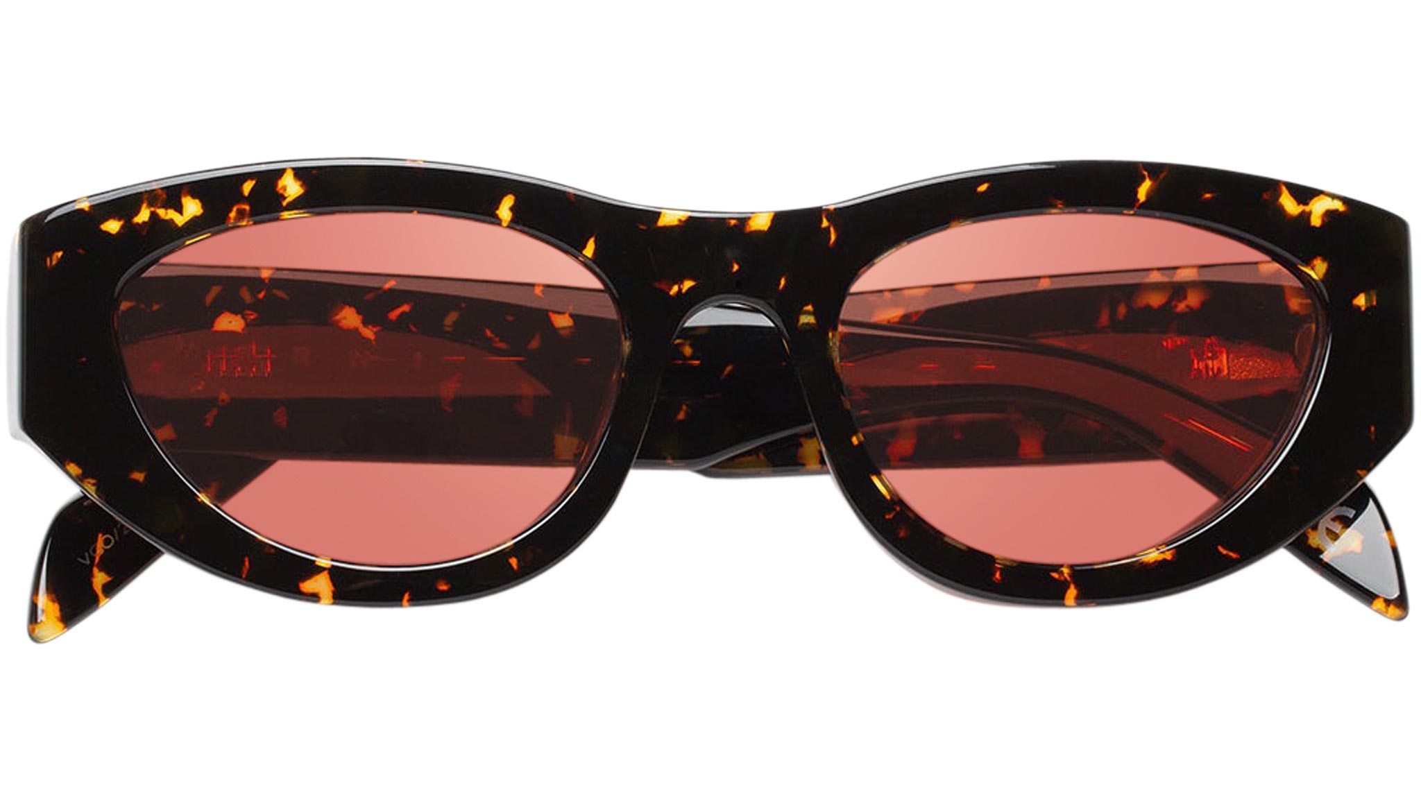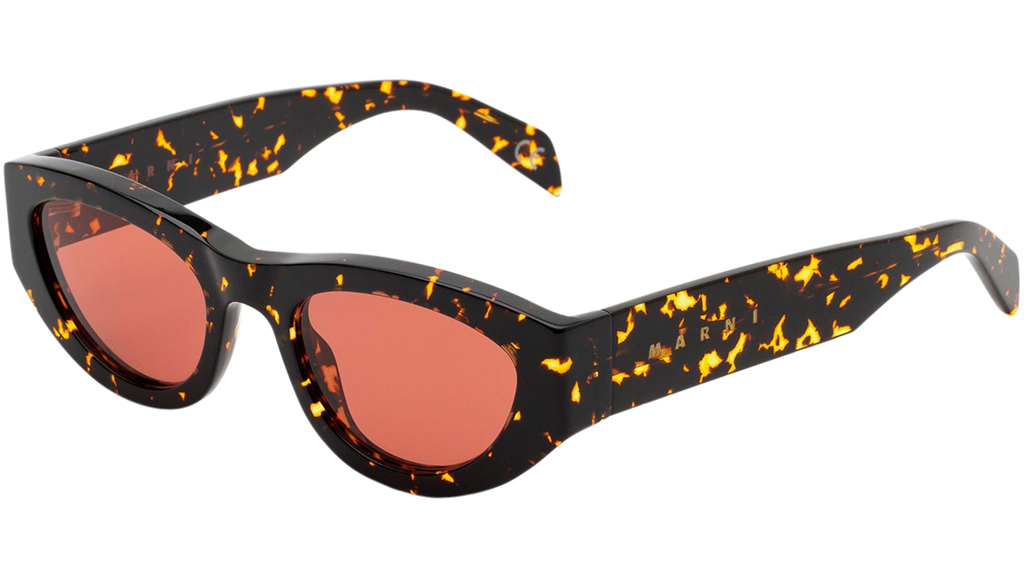 Designed exclusively for Marni, Rainbow Mountains is a fresh contemporary interpretation of classic feminine frames, reshaped for a more fluid, genderless approach to style. The model features a rounded silhouette with carefully shaped rims encasing oval lenses. Thick temples are engraved with Marni logo. This version that comes in a vibrant Havana acetate and contrasting red tinted lenses. Sizes: Lens Width: 52 mm. Frame Front: Frame Side: 145 mm.
