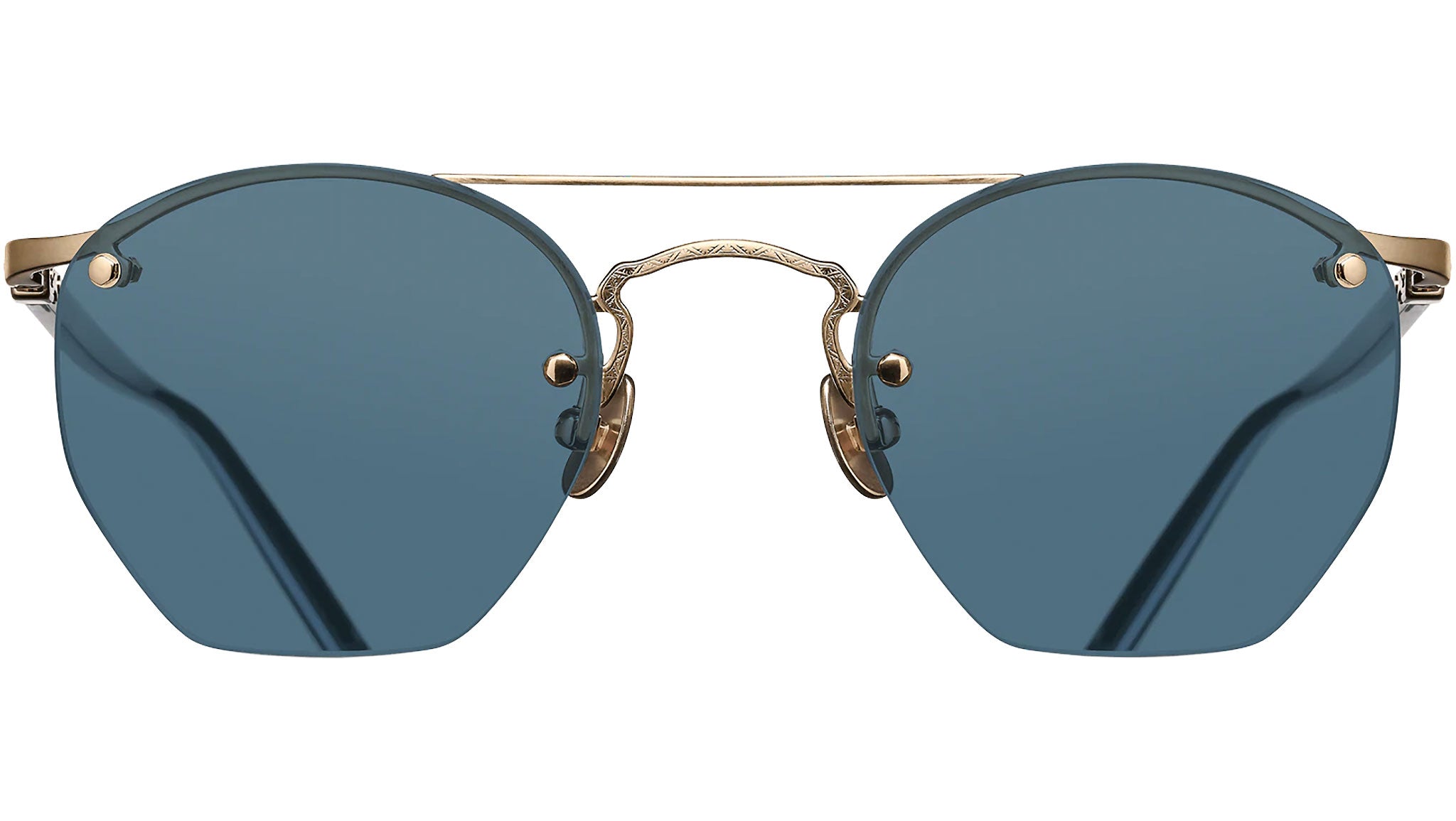 The M3117 expresses a sense of duality, while it is concise in its body, featuring only a top rim holding the lenses, it is orante in its aesthetic, utilizing a pantos style lens but an aviator inspired bar atop the frame. The temples express the same duality, with a thin body of Japanese Acetate surrounding a precious metal skeleton balanced with ornate metalwork. Lightweight titanium construction. Floating lens design. Titanium arched top bar. Made in Japan.
