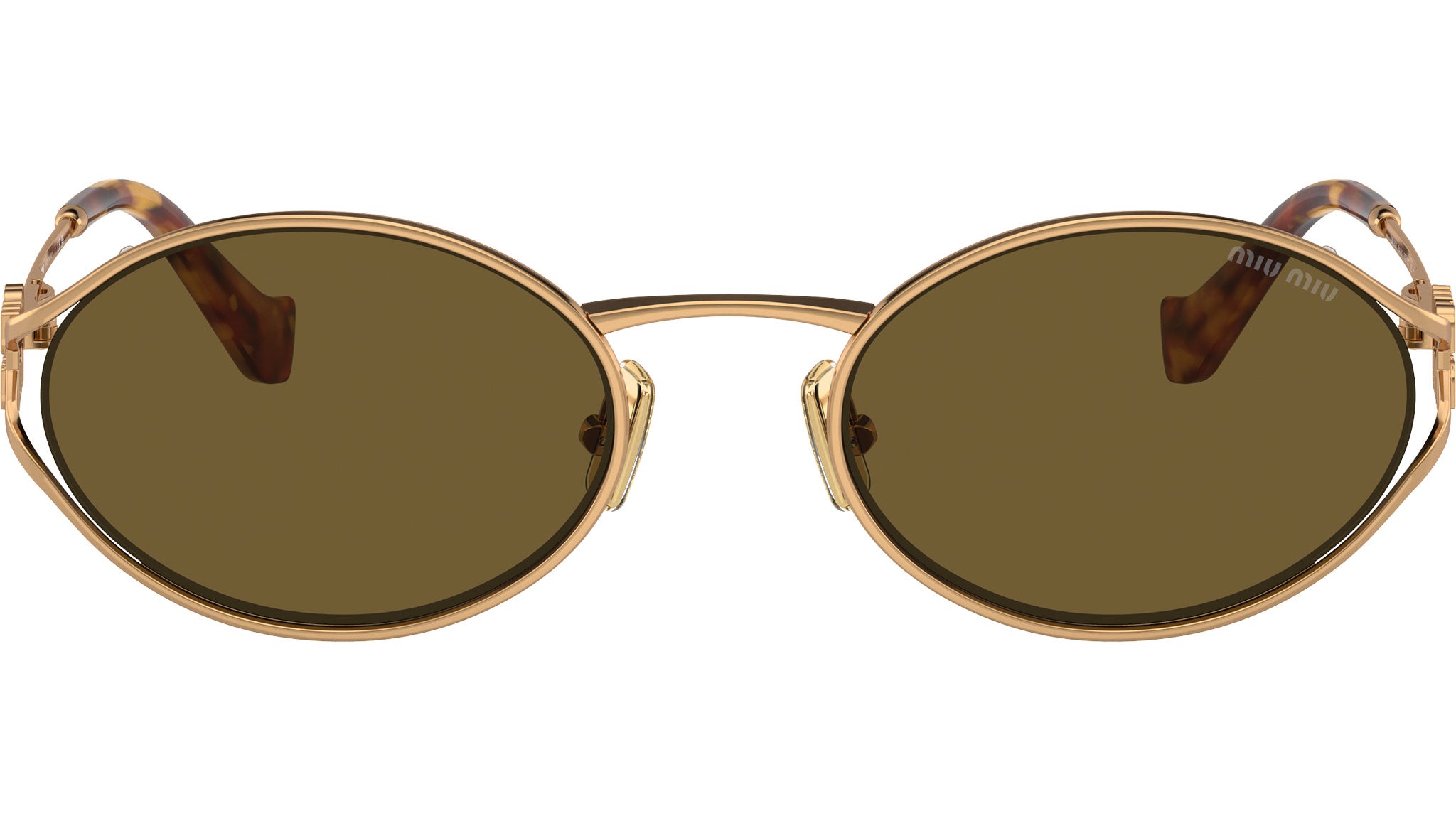 Occhiali da sole Miu Miu modello MU 52YS codice colore 7OE01T con montatura color oro ottone in metallo e lenti color marrone scuro. Miu Miu offre creazioni uniche, in cui la costante ricerca stilistica si combina perfettamente con la maestria artigianale della lavorazione. Le silhouette femminili e sinuose delle montature sono espressione di una ricchezza dei dettagli che rispecchia pienamente i codici stilistici e l’indiscusso talento del brand nell’unire il design non convenzionale ad un romanticismo dai rimandi retrò.