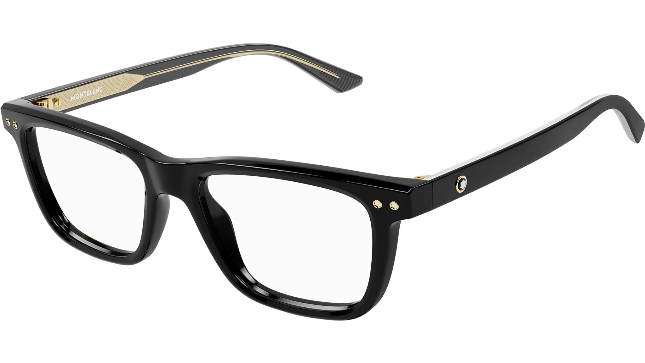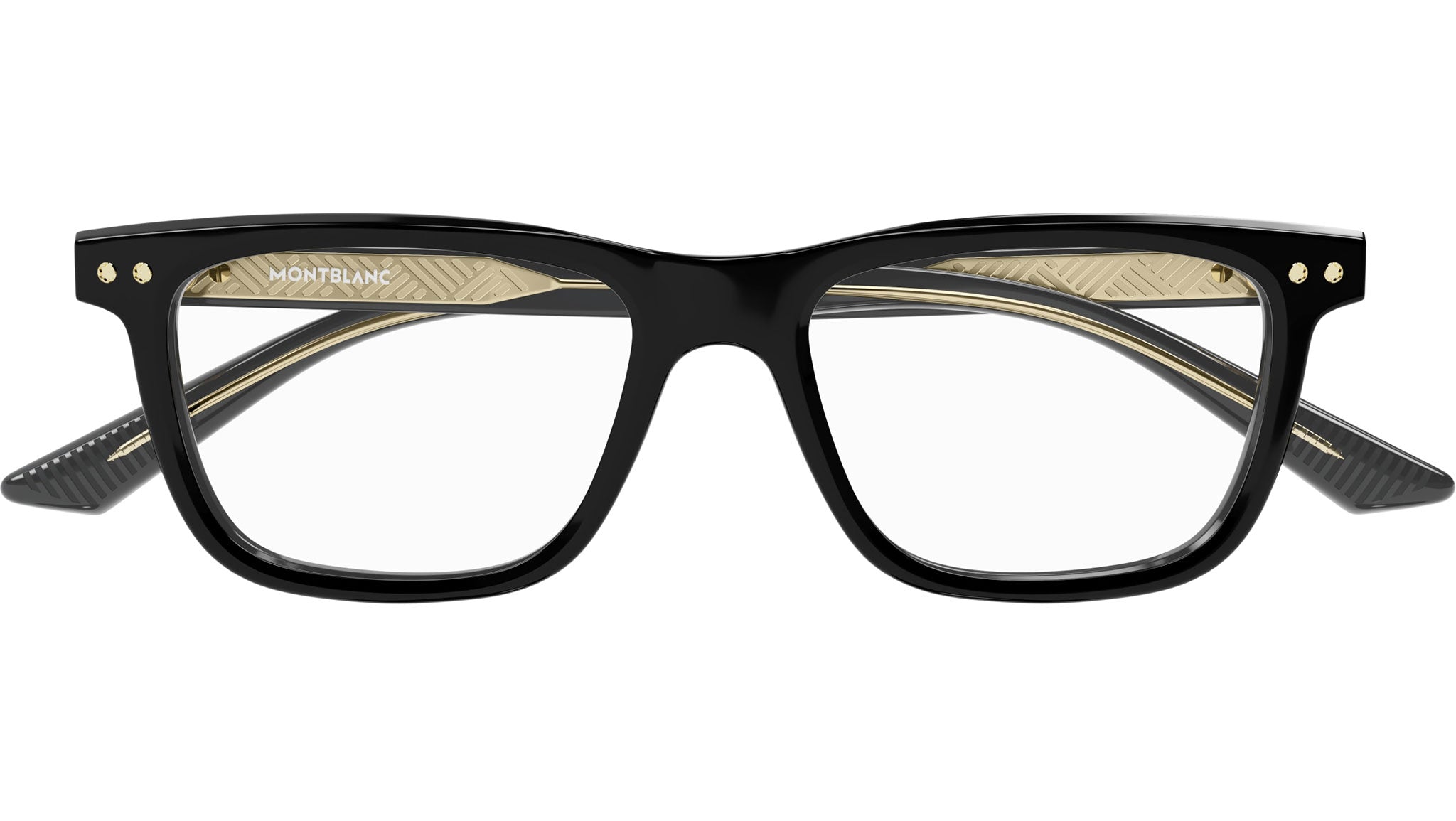 Occhiali da vista Montblanc modello MB0322O linea Snowcap forma rettangolare in acetato riciclato, codice colore 005 nero lucido tinta unita con aste color nero e lenti demo.