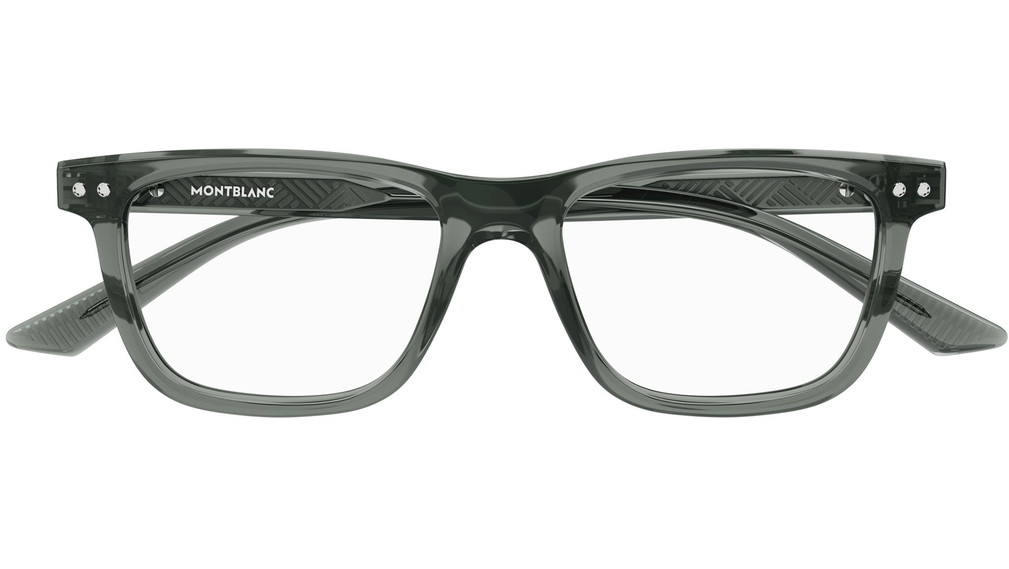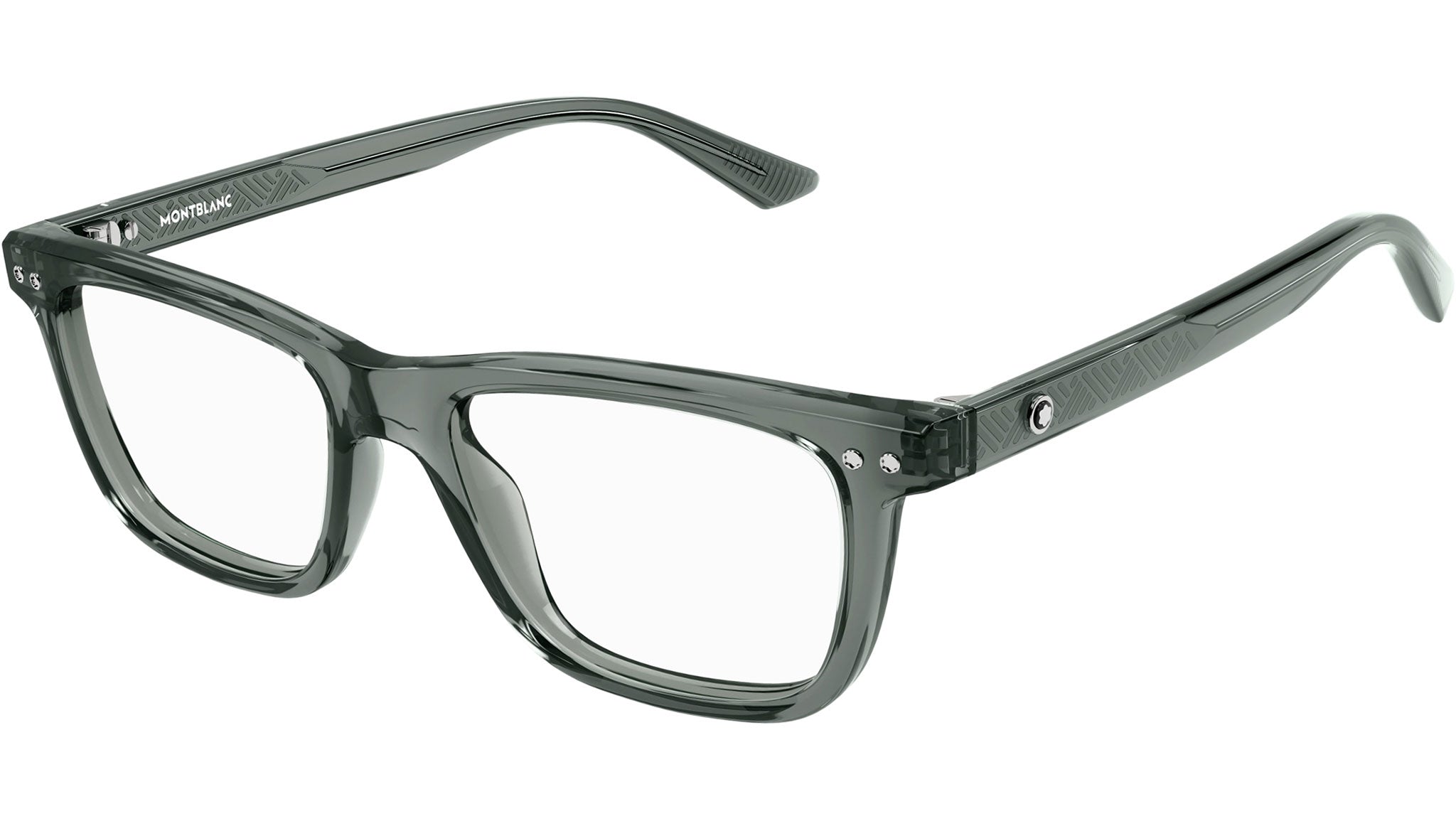 Occhiali da vista Montblanc modello MB0322O linea Snowcap forma rettangolare in acetato riciclato, codice colore 008 grigio trasparente lucido con aste color grigio e lenti demo.