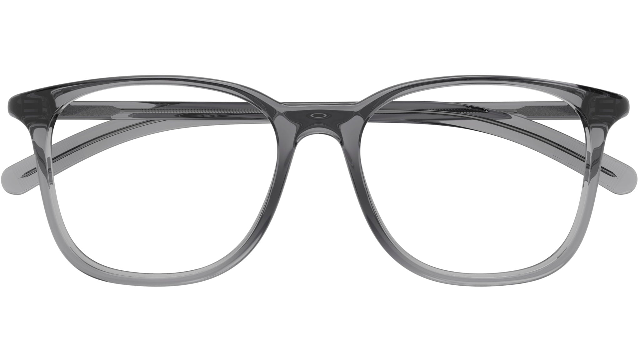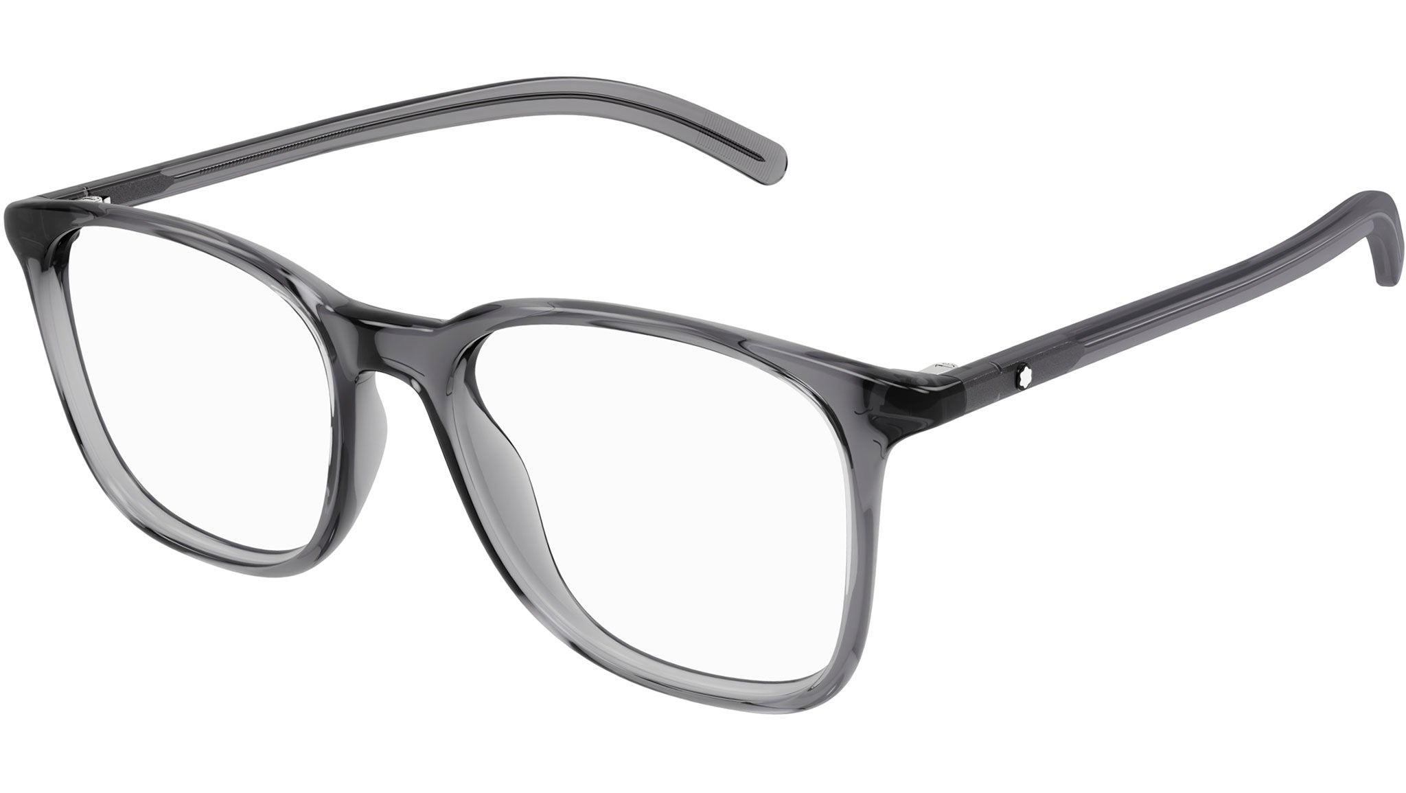 Occhiali da vista Montblanc modello MB0327O linea Snowcap forma rettangolare in acetato iniettato riciclato, colore grigio trasparente lucido con aste color grigio e lenti demo.