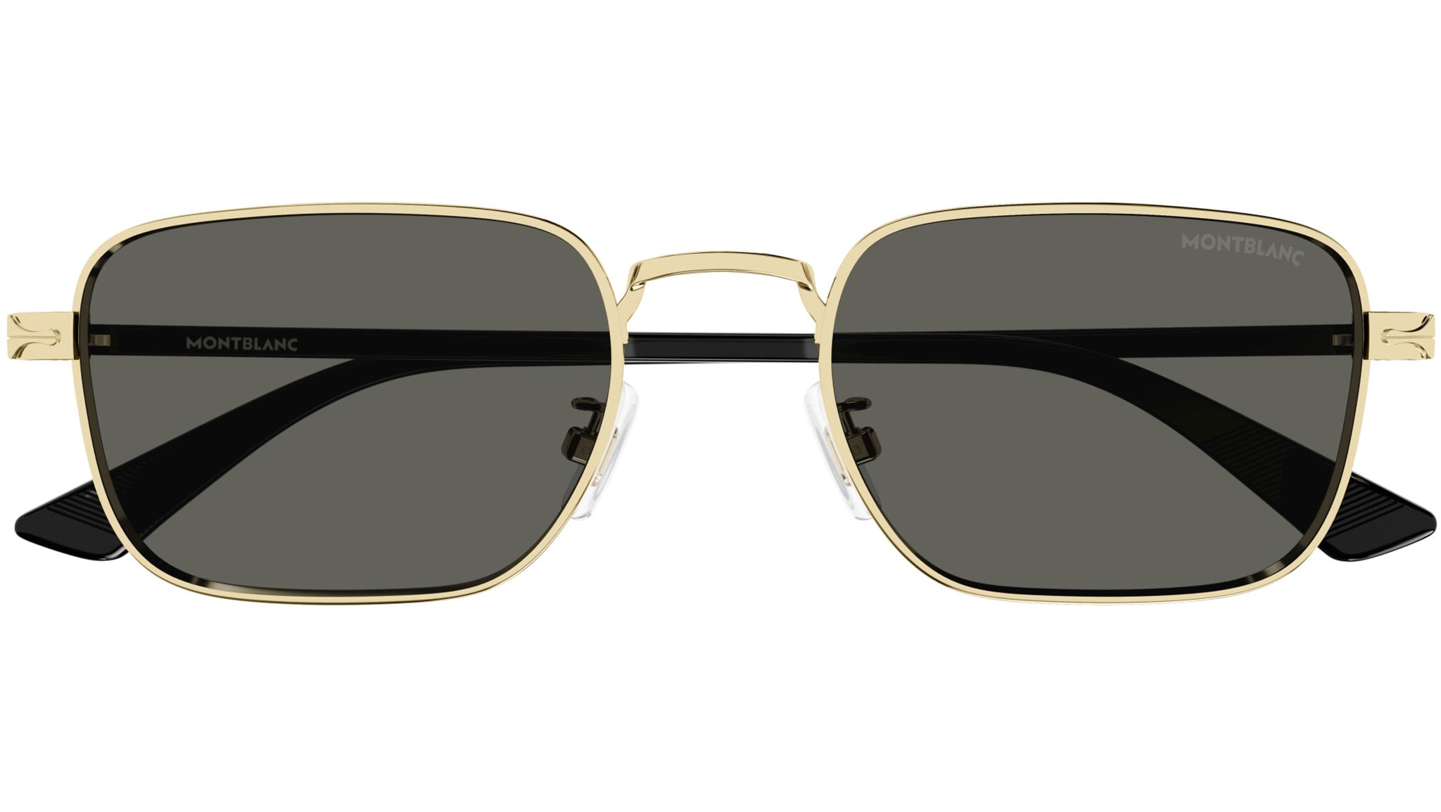 Occhiali da sole Montblanc modello MB0339S linea Nib forma rettangolare in metallo, codice colore 001 oro endura lucido J5G con aste color nero e lenti color grigio tinta unita.
