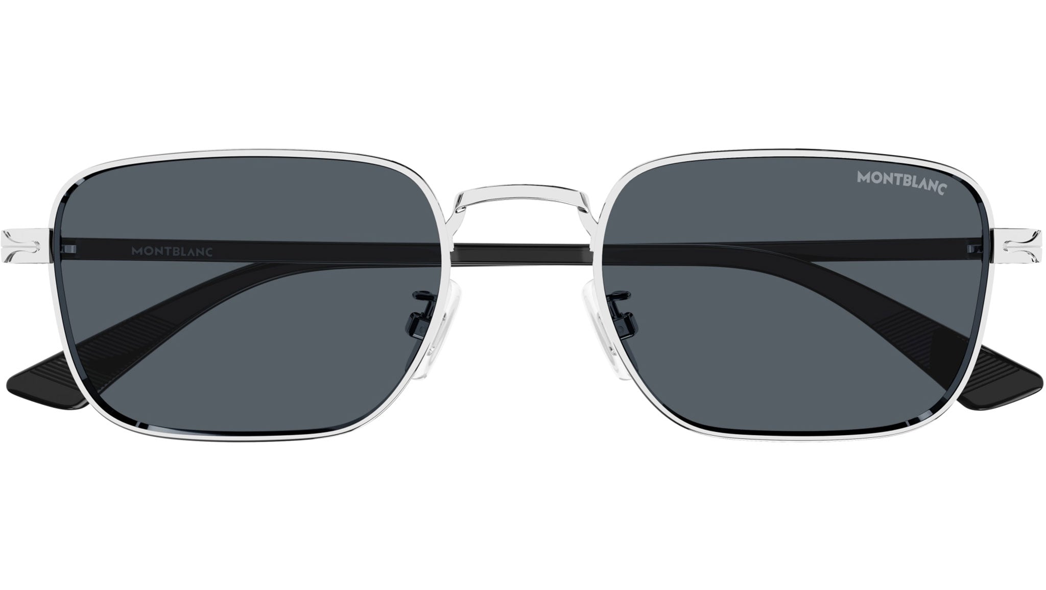 Occhiali da sole Montblanc modello MB0339S linea Nib forma rettangolare in metallo, codice colore 003 argento lucido con aste color nero e lenti color blu tinta unita.
