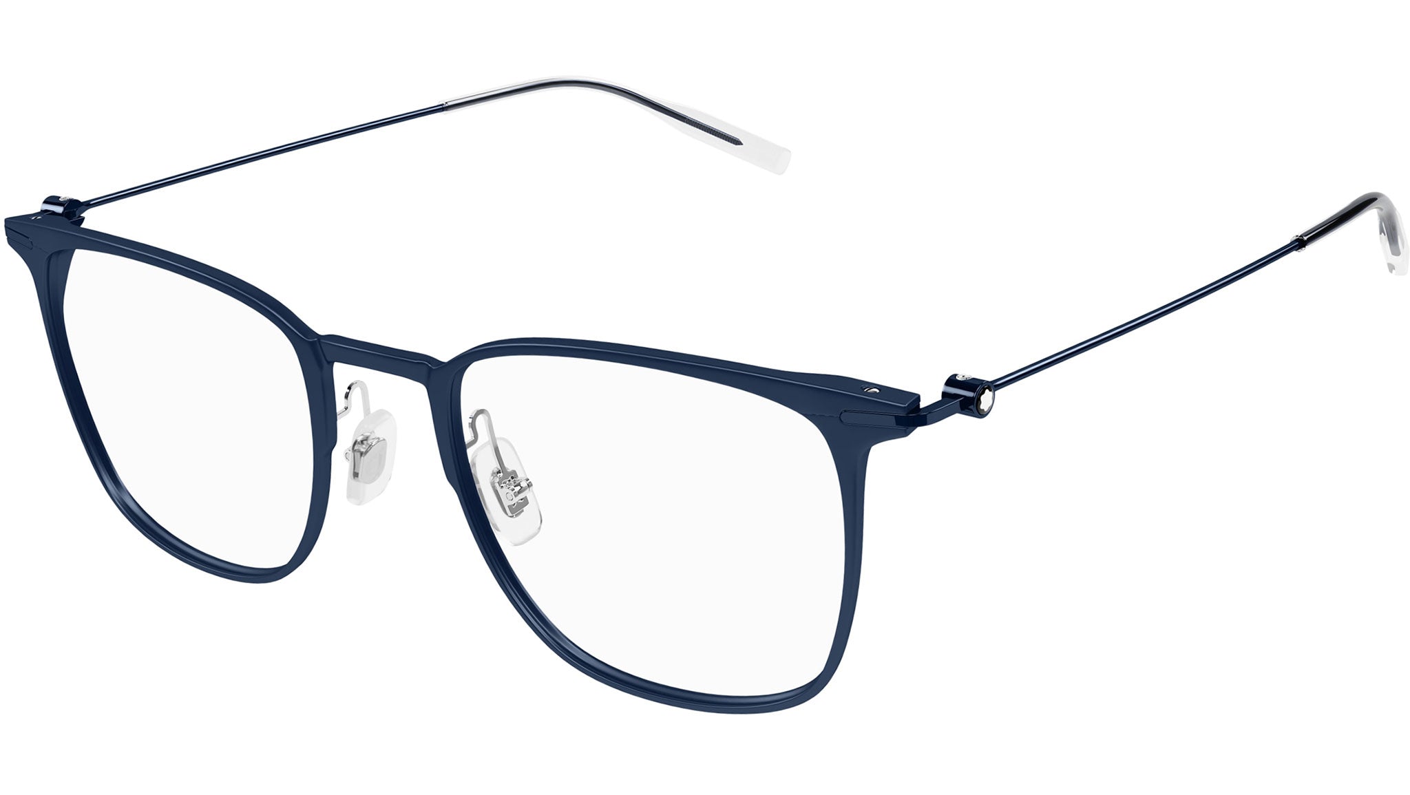Occhiali da vista Montblanc Snowcap modello MB0356O in alluminio rettangolare blu scuro semiopaco con aste in blu e lenti demo. Rivenditore autorizzato Montblanc online. Gli occhiali vengono consegnati con custodia e accessori originali e sono coperti dalla garanzia ufficiale di 12 mesi del produttore.