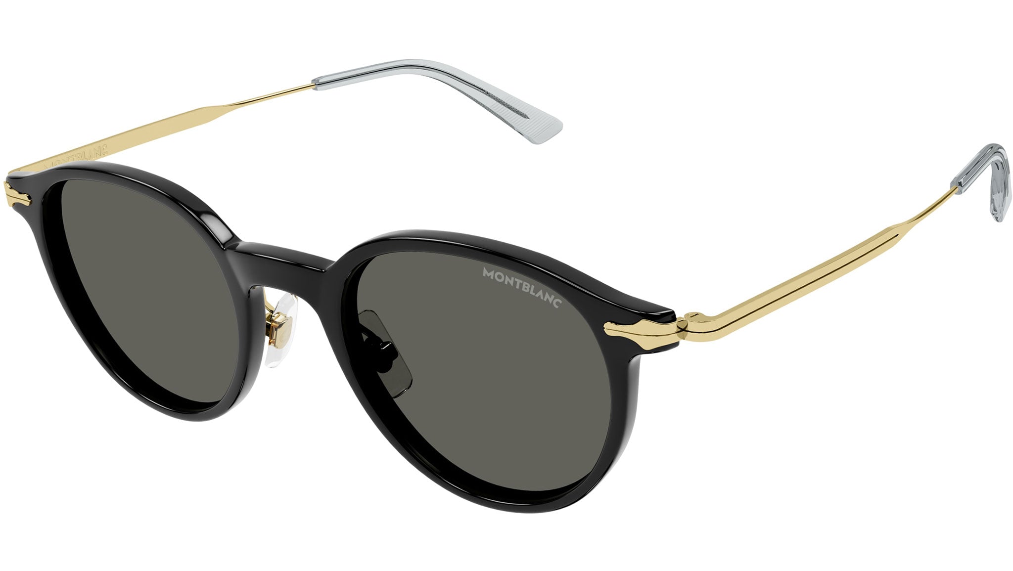 Occhiali da sole Montblanc Nib modello MB0362S in acetato riciclato panto, codice colore 001 nero lucido tinta unita con aste in oro e lenti color grigio tinta unita. Rivenditore autorizzato Montblanc online. Gli occhiali vengono consegnati con custodia e accessori originali e sono coperti dalla garanzia ufficiale di 12 mesi del produttore.