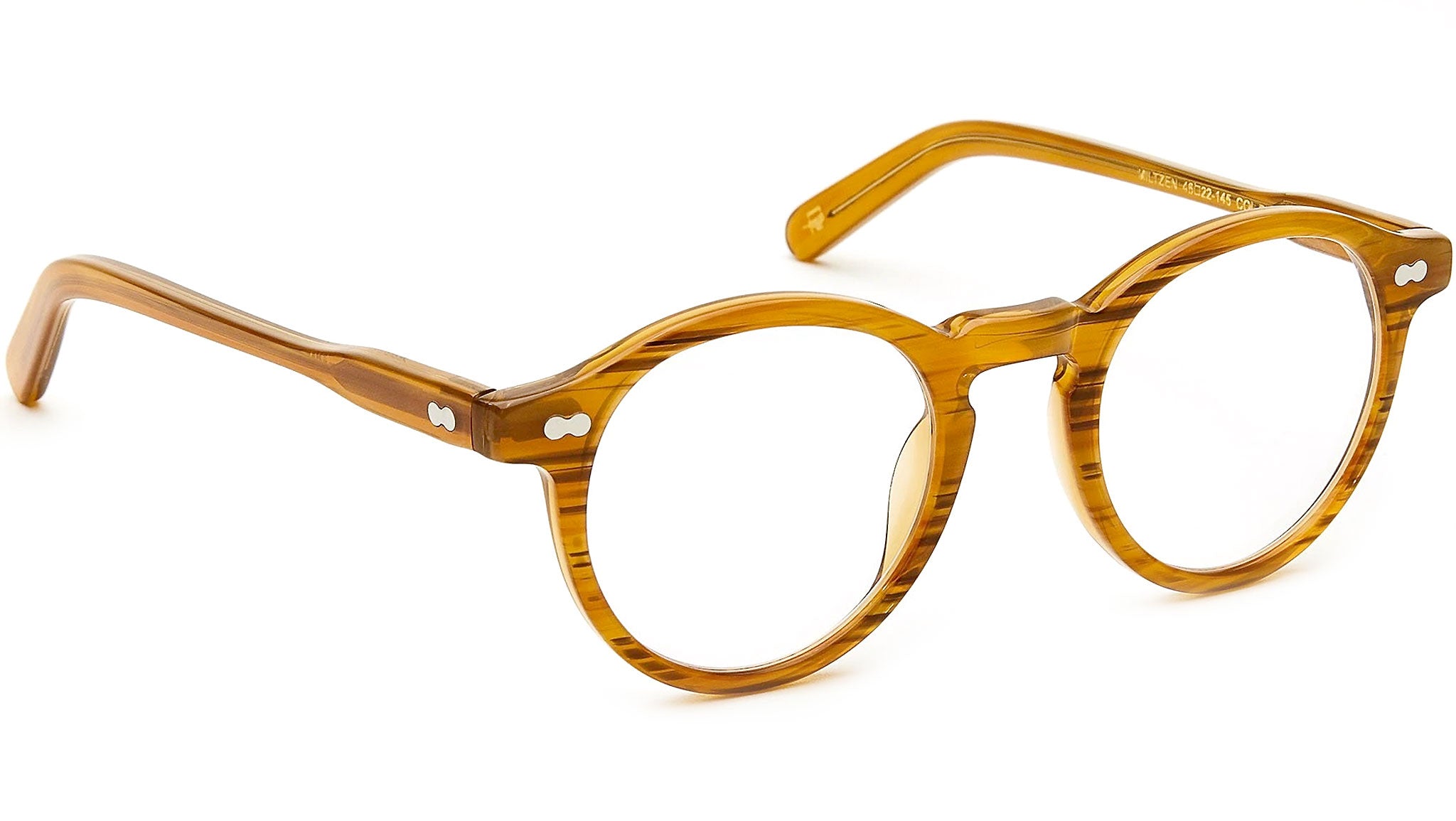 The round, full-vue Miltzen, first introduced in the 1930s, is eponymously named for our Uncle Heshy, who inexplicably everyone called Uncle Miltzen. And it stuck. So there you go, world... The Miltzen. Handcrafted using Italian acetate featuring unique patterns distinctive to each frame Features two adjoined dot rivets. Comfortable key hole nose bridge. Includes acetate nose pads. 3-Barrel hinge. Moscot temple engravings. Signature acetate tips.