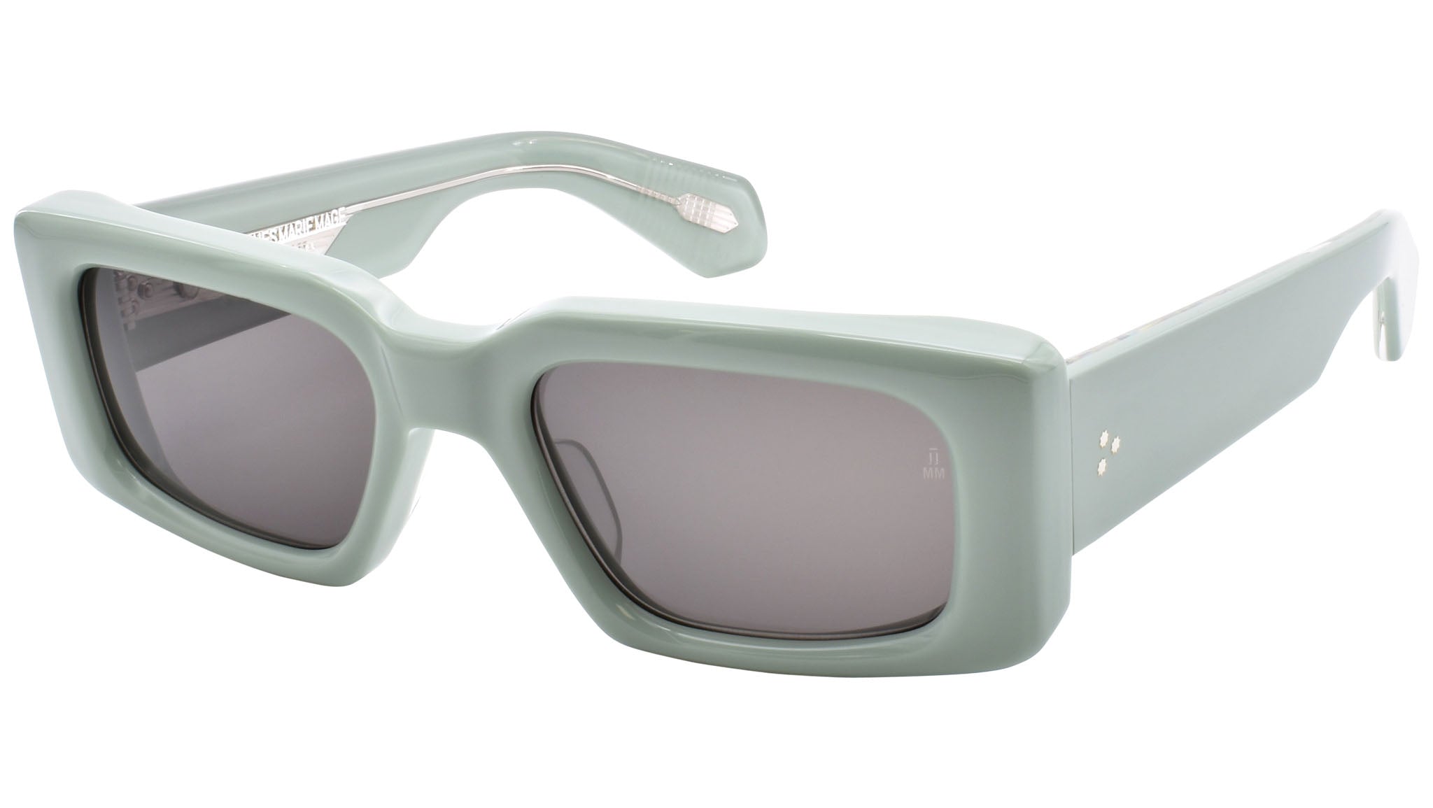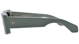 Green 9mm cured cellulose acetate frame custom acetate temples and black lenses. Exposed wirecore. Sterling silver tension secured custom 9 barrel hinge. Black CR-39 8 base lens with backside anti-reflective treatment. 100% UV protection.