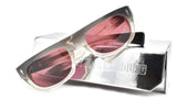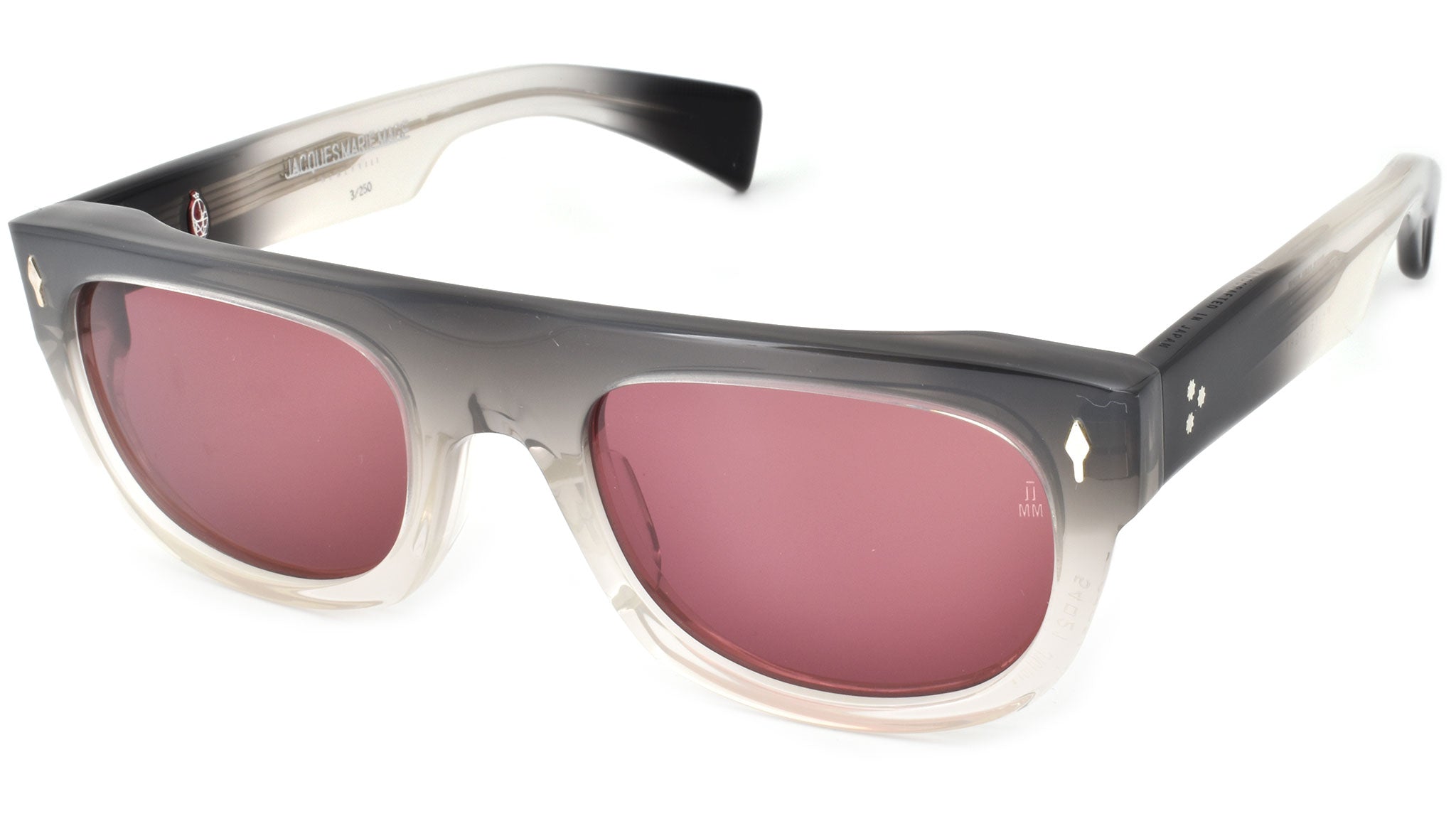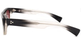 Handcrafted in Japan. Material: 10mm black fade cured cellulose acetate frame, custom double laminated acetate temples featuring precious metal hardware. Hardware: Sterling silver signature arrowhead front pin. Silver custom hairline engraved wire core design. Silver tension-secured custom hinge with spur-shaped rivets. Burgundy domed 3D metal cameo logo. 6 base CR-39 soft red lens with backside anti-reflective treatment. 100% UV protection