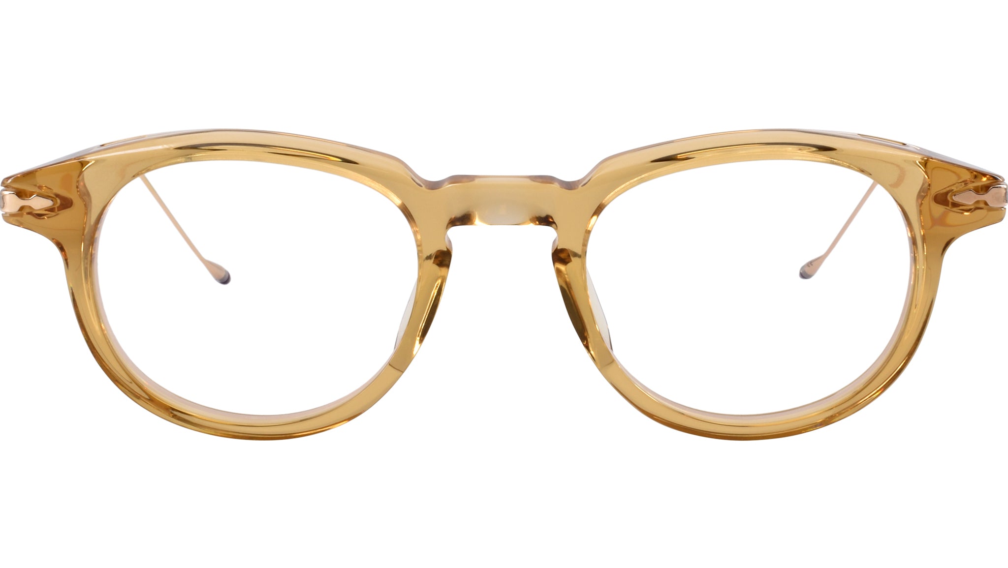 An easy-to-wear oval shape with keyhole nose bridge. Features the new JMM hinge construction, with decorative front pins that seamlessly attached to - and move with - the hinge. Titanium temples feature Native American-inspired filigree designs and an updated temple tip shape with signature burgundy epoxy detail. Light gold 100% beta titanium temples and 4mm acetate front with clear lenses. Monoblock titanium hinge construction. Ocre acetate front, gold hardware. Demo lens CR-39.