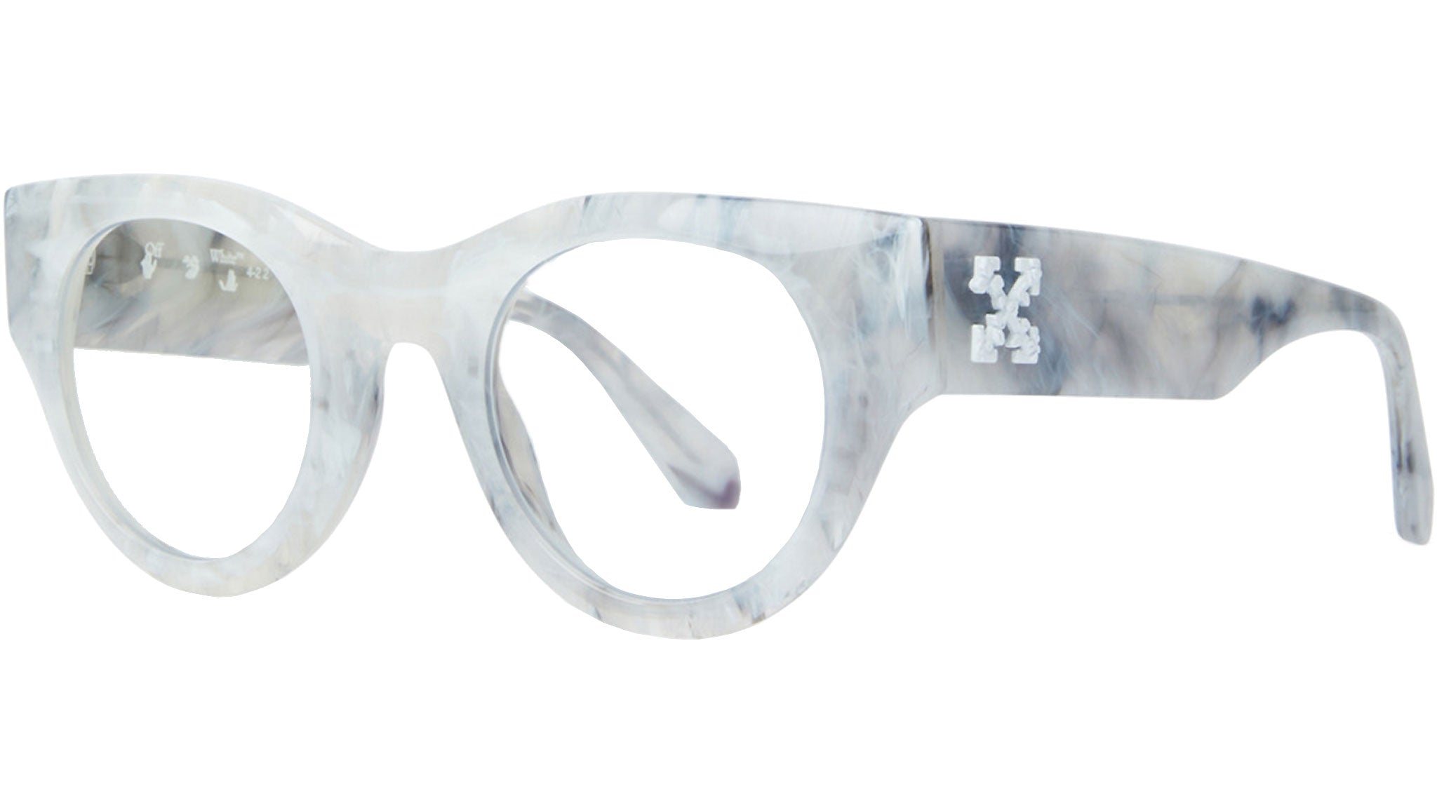 Come diceva il Direttore Creativo Virgil Abloh: "le forme sculturee sono arrivate anche sulle montature da vista". Lo stile Optical 13 ha fresature e giochi di volume che creano un effetto 3D. Di forma rotonda con estremità superiori allungate inaspettate, questo acetato è il risultato di una «contaminazione» di due forme: il panthos e la silhouette rotonda. Le aste alte sono impreziosite dal logo a freccia con foglie di edera in metallo galvanizzato. Questo modello è dotato di lenti blue che bloccano i raggi degli schermi ma può supportare quelle da vista.