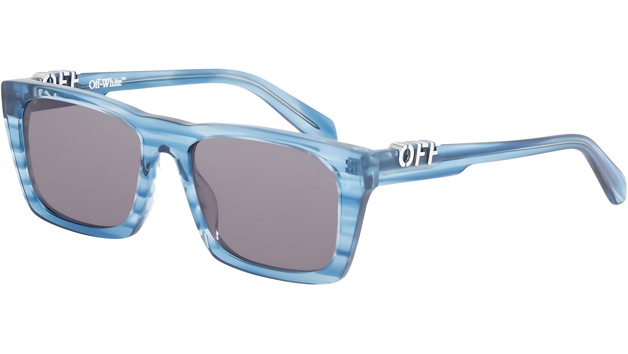 Occhiali da sole Off-White modello Albany codice colore 4407 con frontale in acetato blu striato e lenti cat. 3 in polimero CR-39 grigio scuro. Rivenditore autorizzato Off-White Eyewear online. Gli occhiali vengono consegnati con custodia e accessori originali e sono coperti dalla garanzia ufficiale di 12 mesi del produttore.