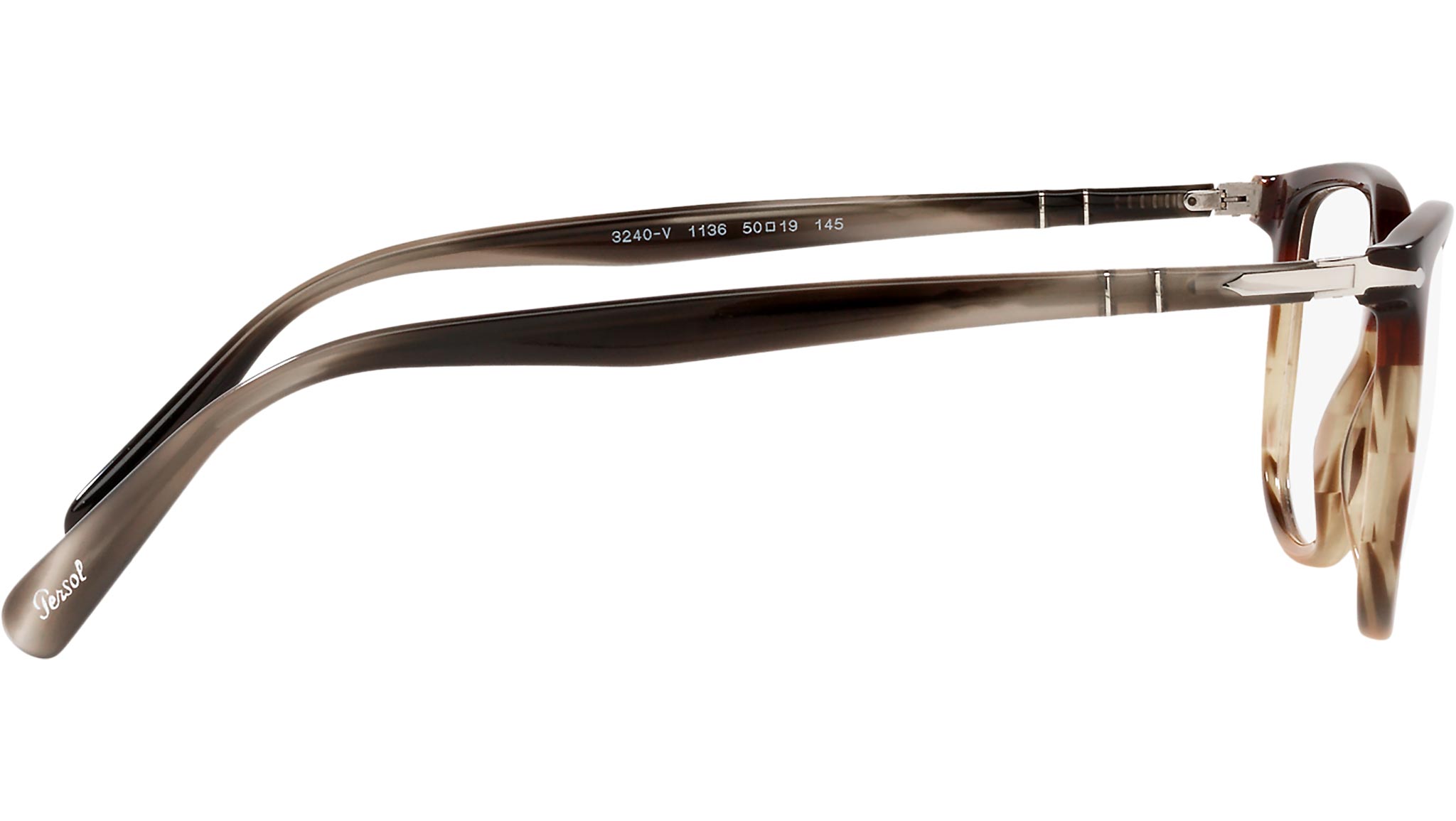 Occhiali da vista Persol modello PO3240V codice colore 1136 con montatura full rim in acetato color a righe marrone e grigio e beige e lenti demo.