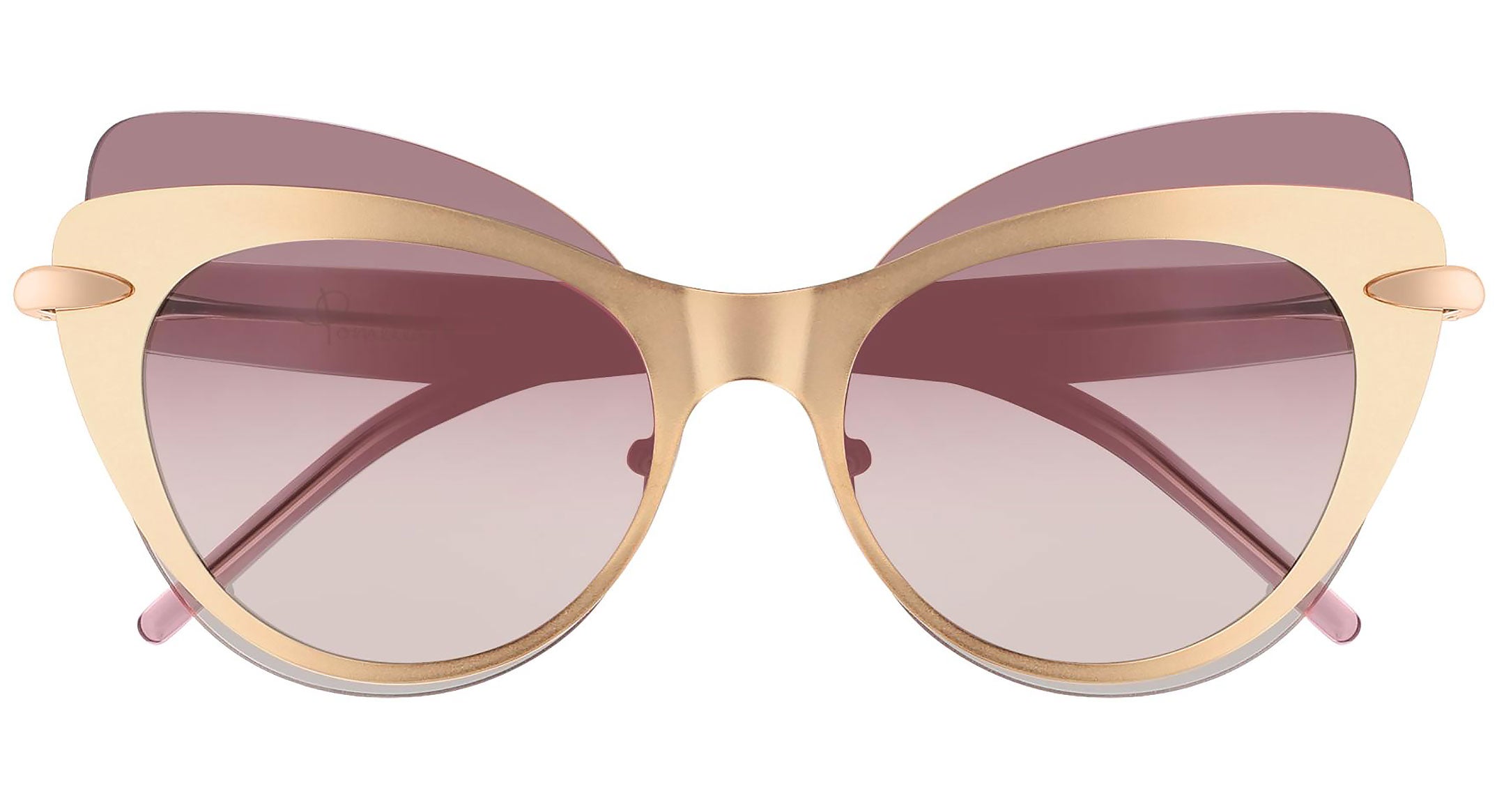 Pomellato sunglasses collection model PM0046S 002 featuring semimatte rose gold/shiny rose gold frame and violet lens. The eyewear collection reflects the iconic, colorful and unconventional aesthetic of Pomellato, reinterpreting its voluptuous shapes and precious features in a covetable selection poised on the flawless balance between artisanal precision and timeless elegance.