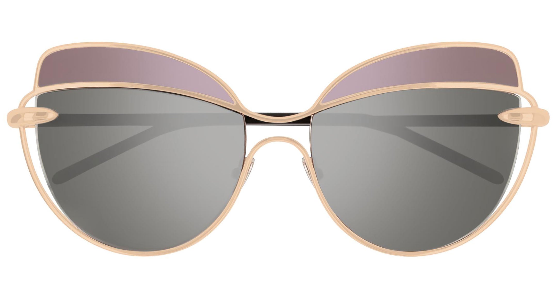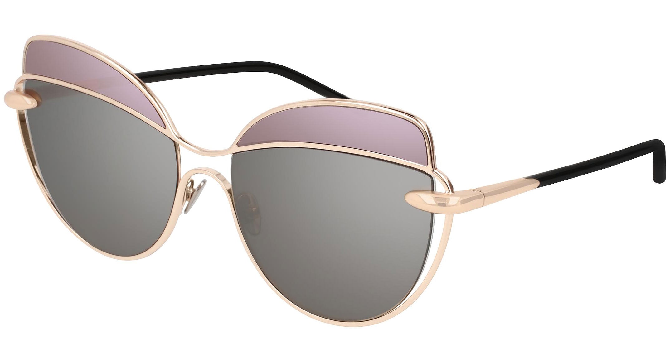 Pomellato sunglasses collection model PM0056S 001 featuring shiny pink gold/grey frame and grey lens. The eyewear collection reflects the iconic, colorful and unconventional aesthetic of Pomellato, reinterpreting its voluptuous shapes and precious features in a covetable selection poised on the flawless balance between artisanal precision and timeless elegance.