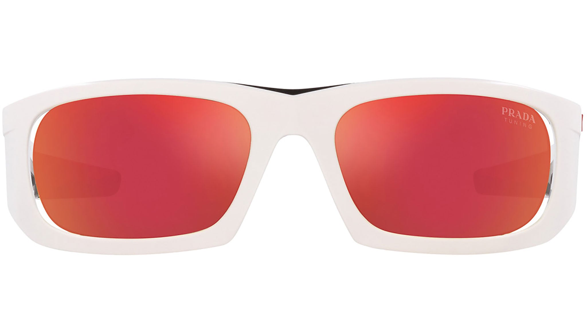 Occhiali da sole Prada Linea Rossa modello PS02YS nella variante colore AAI04U bianco opaco / nero con lenti color arancione multilayer. Una perfetta fusione dei concetti di sportswear ed eleganza contemporanea: la linea di occhiali da sole Prada Linea Rossa declina in un moderno stile casual tutta la qualità e la raffinatezza artigianale della maison Prada.
