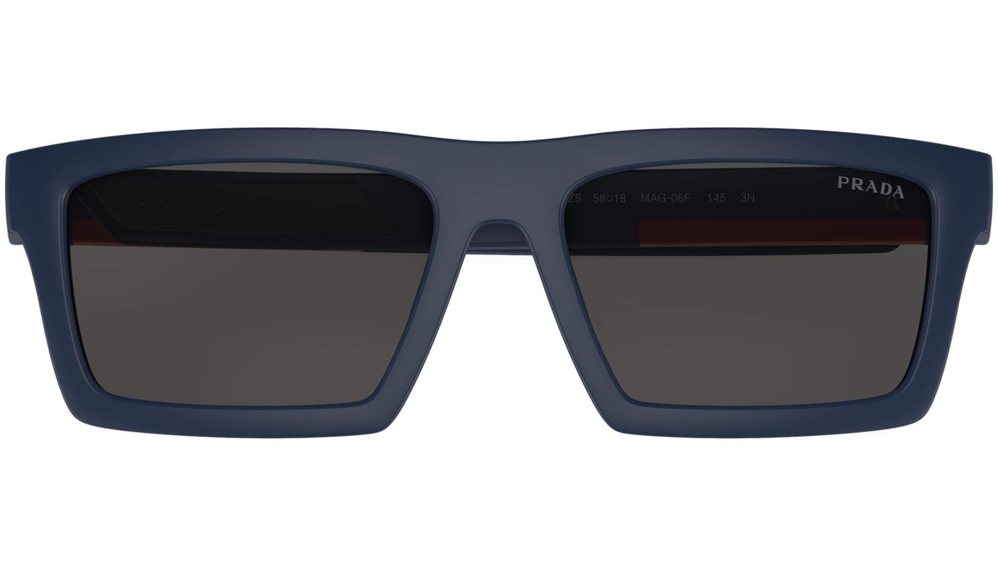 Occhiali da sole Prada Linea Rossa modello PS 02ZSU codice colore MAG06F con montatura rettangolare full rim in iniettato color blu opaco e lenti in poliammide color grigio scuro. Rivenditore autorizzato Prada. Ogni prodotto Prada Linea Rossa viene consegnato con astuccio originale e accessori.
