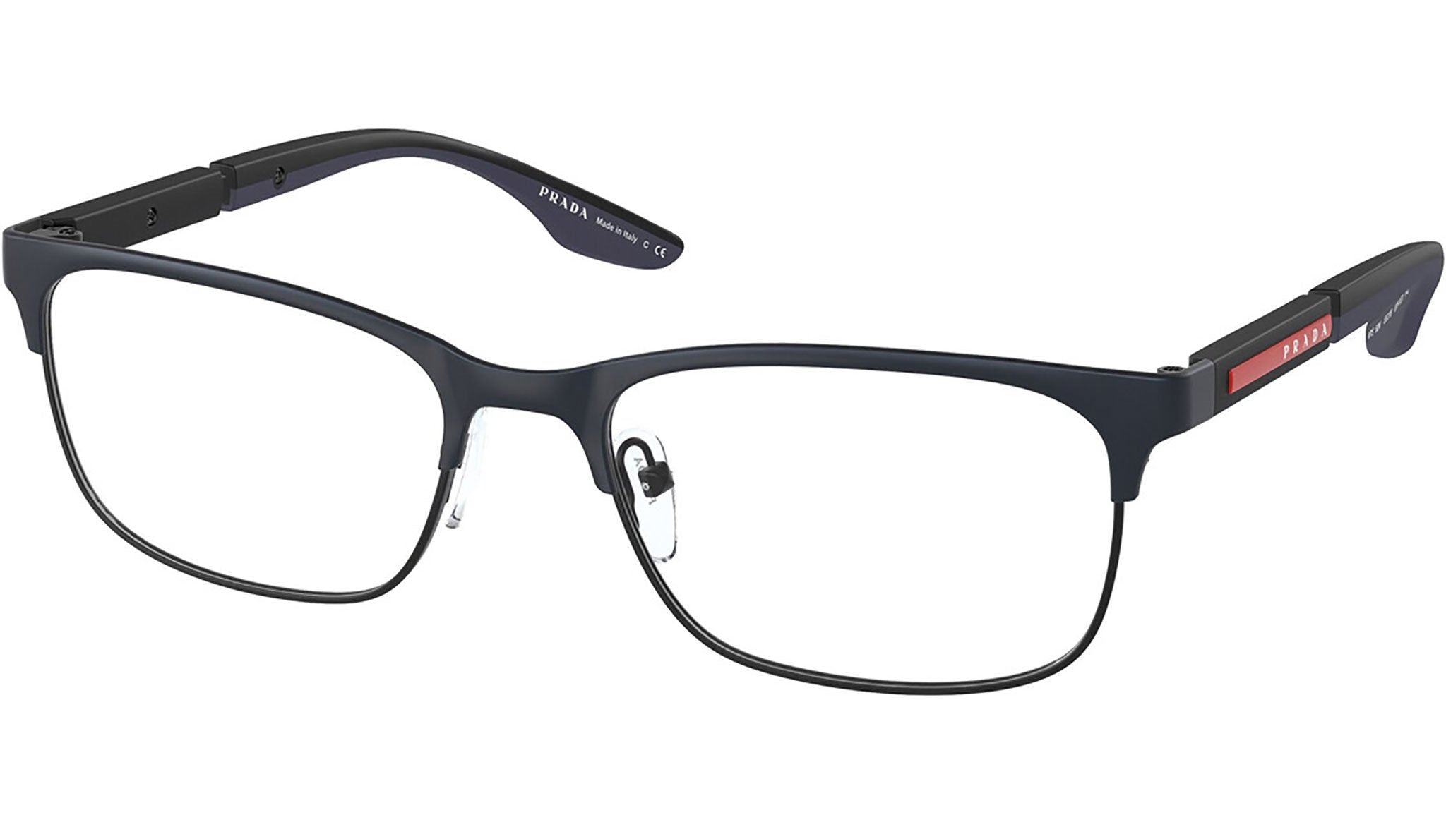 Occhiali da vista Prada Linea Rossa modello PS 52NV variante colore gomma blu e gomma nera, codice colore 07P1O1. Nuove prospettive, sintesi perfetta di abbigliamento sportivo e eleganza contemporanea: gli occhiali della collezione Prada Linea Rossa esprimono il più perfetto casual style con la migliore qualita arigianale e la cura dei dettagli propri della maison Prada.