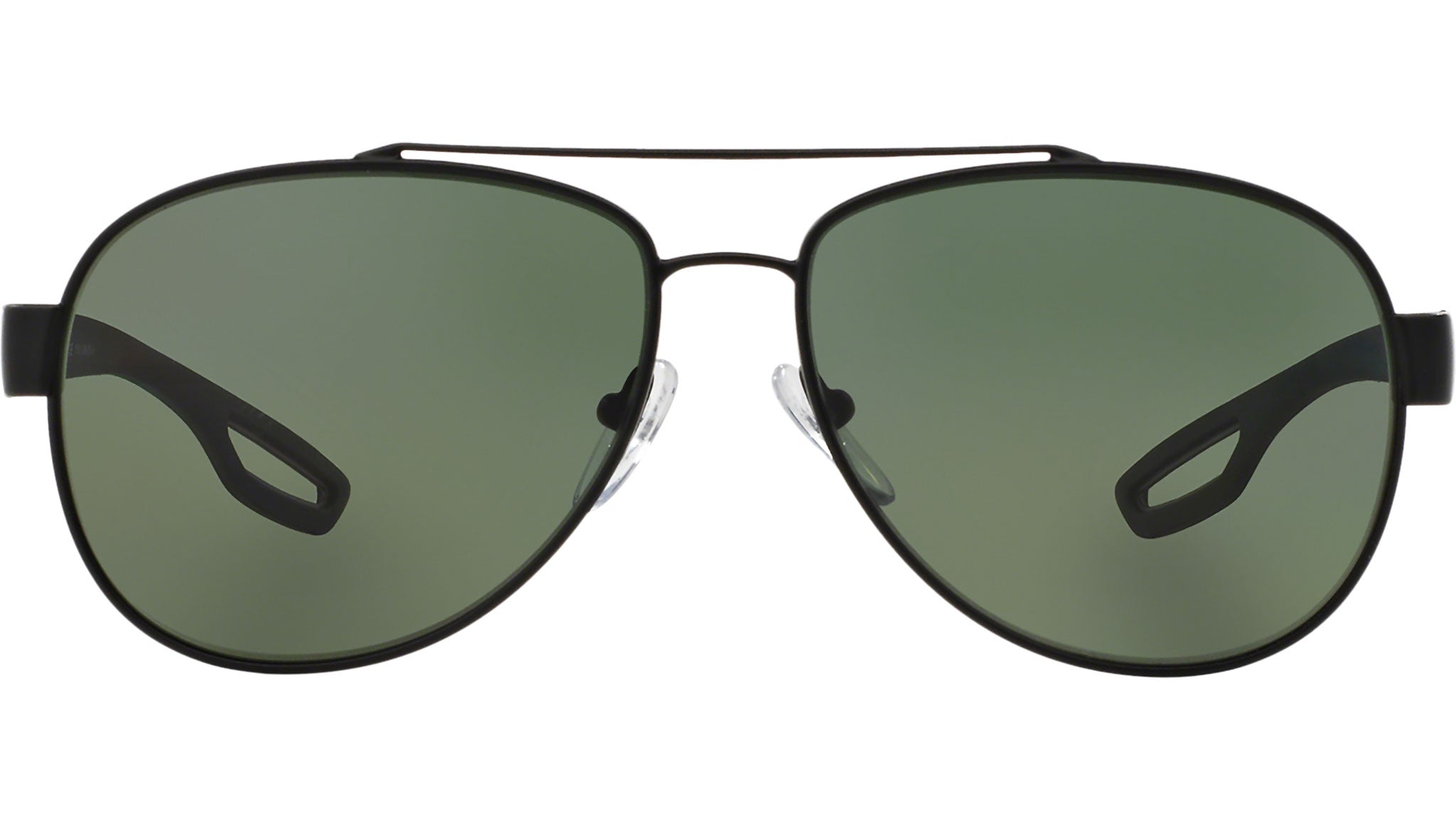 Prada Linea Rossa sunglasses model PS 55QS, black rubber frame variant, color code DG05X1 with polar green lens. Prada Linea Rossa Sun Collection conveys an everyday casual style with all the quality and craftsmanship of the Prada brand.