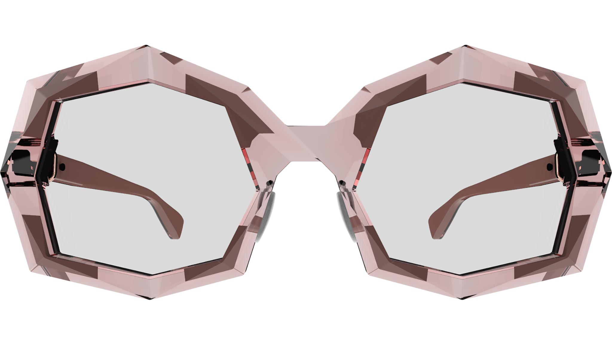 Pugnale Eyewear optical model P427V Journey color code 59 in crystal brown. Full rim geometric acetate frame with demo lens. The brand's identifying logo proudly marks the Priscilla line of Pugnale Eyewear. The woman is a diamond, multifaceted in every aspect. She embodies strength and sweetness, tenacity and courage, perseverance and charisma - adjectives that converge to form a singular expression of beauty. Vivid and radiant colors blend with femininity in iconic shapes, reimagined in the way Pugnale Eyewear uniquely appreciates, characterized by boldness and high design content.