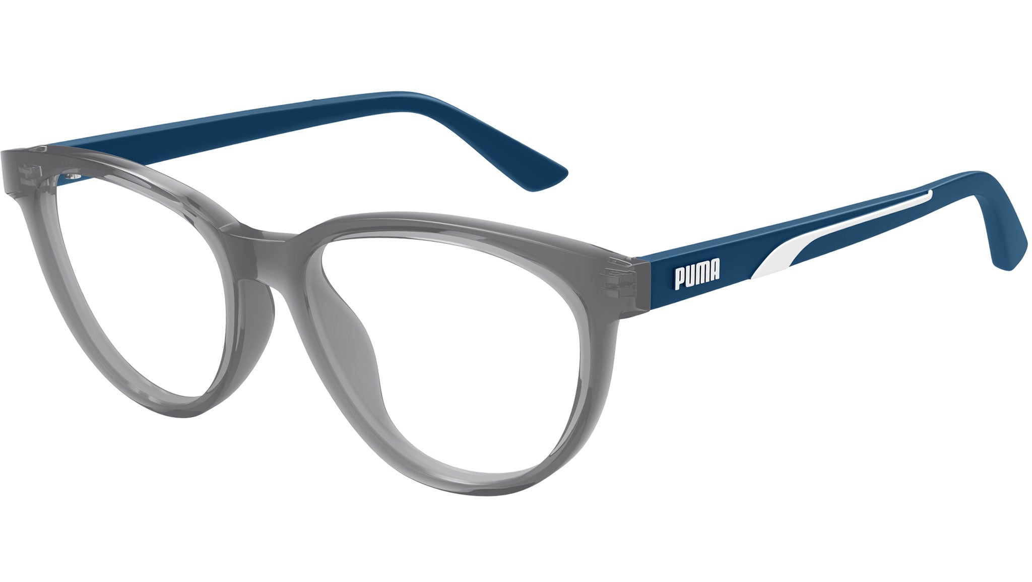 Occhiali da vista Puma Junior modello PJ0079O variante colore 002 grigio trasparente lucido con lenti demo. Rivenditore autorizzato Puma online. Gli occhiali vengono consegnati con custodia e accessori originali e sono coperti dalla garanzia ufficiale di 12 mesi del produttore.