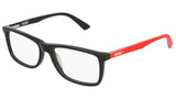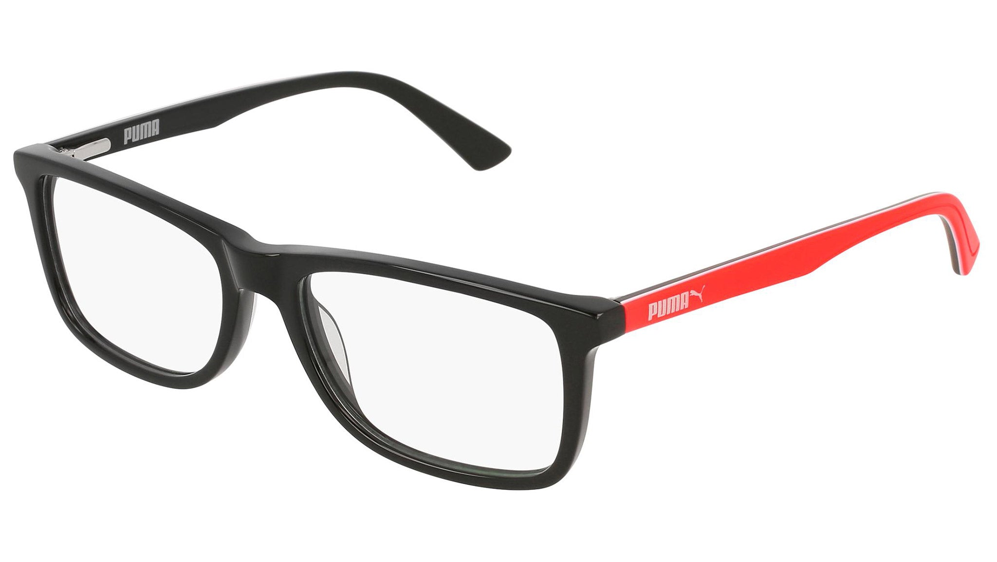 Puma for Kids model PJ0020O 005 shiny black optical frame. These kids are on the move. They roam the streets in search for recognition, emotions and daily kicks: celebrating with friends at the Luna Park, a thrilling jump, a trick on a skateboard, or simply seeing something new.