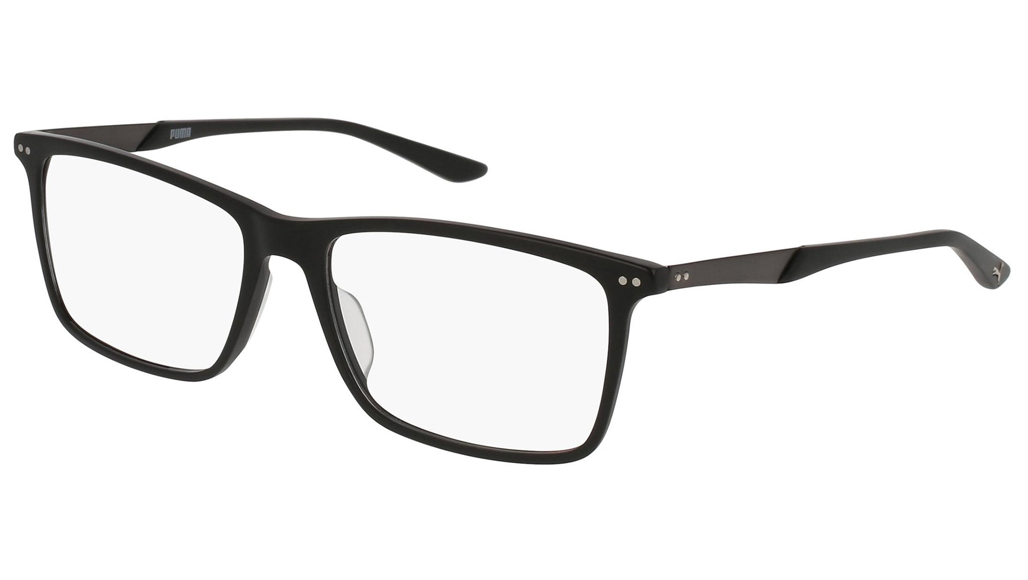 Puma Eyewear model PU0096O 001 matte black optical frame. Designed to fit the movers and the shakers, who seek a dynamic lifestyle. Puma Eyewear is for the hustler, the bold and the Active, for those who see beyond trends and challenge the norm to move things forward.