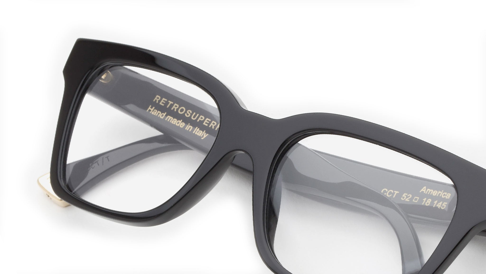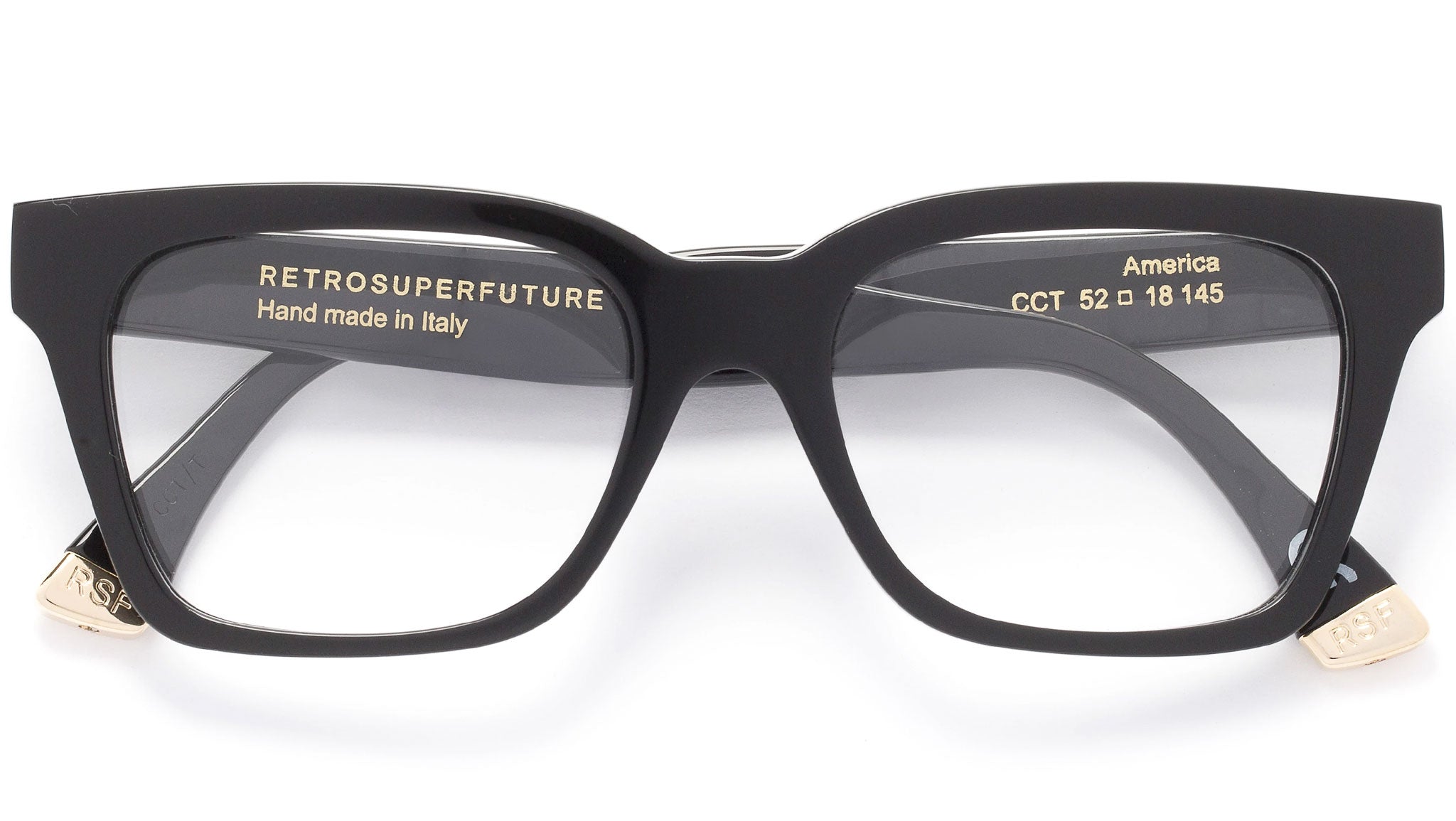 America is an angular, wide silhouette with thick rims and sharply defined angles. A redesign of the classic RSF model, this version of America features a light, yet sturdy structure for an all-day-everyday use. Thismodel comes in a shiny black acetate. Prescription lenses not included.The box contains a hard case and a cleaning cloth.