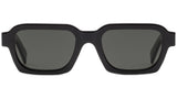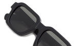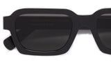 Caro is a wide, geometric silhouette that blends 1960s Italianclassicism with 1990s grunge aesthetic. The model features a well-rounded design with a thick, sturdy acetate structure, squared temple tips and angular rims on the lower half of the frame. This version of Caro comes with black lenses and an all-black acetate.
