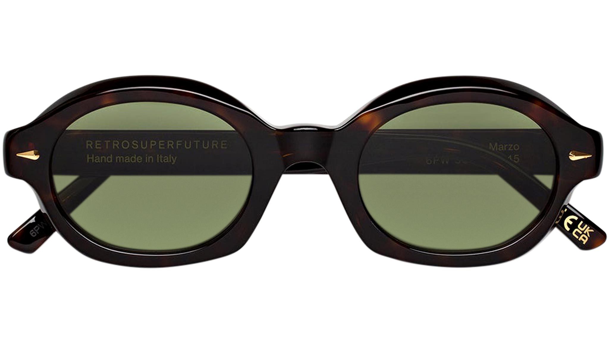 Oval and compact, Marzo is an exciting silhouette in RSF’s roster. Characterized by chunky acetate rims, a signature RSF feature, the model draws inspiration from 1960s shapes, with its low, protruding temple tips and oval lenses. With hand-crafted decors and sleek temples, this is a fresh take on casual everyday sunglasses. This version comes in a vibrant 3627 Havana acetate with bottle green lenses and gold decors. Sizes: R Lens Width: 50 mm. Frame Front: Frame Side: 145 mm. Product Code Size R: 6PW