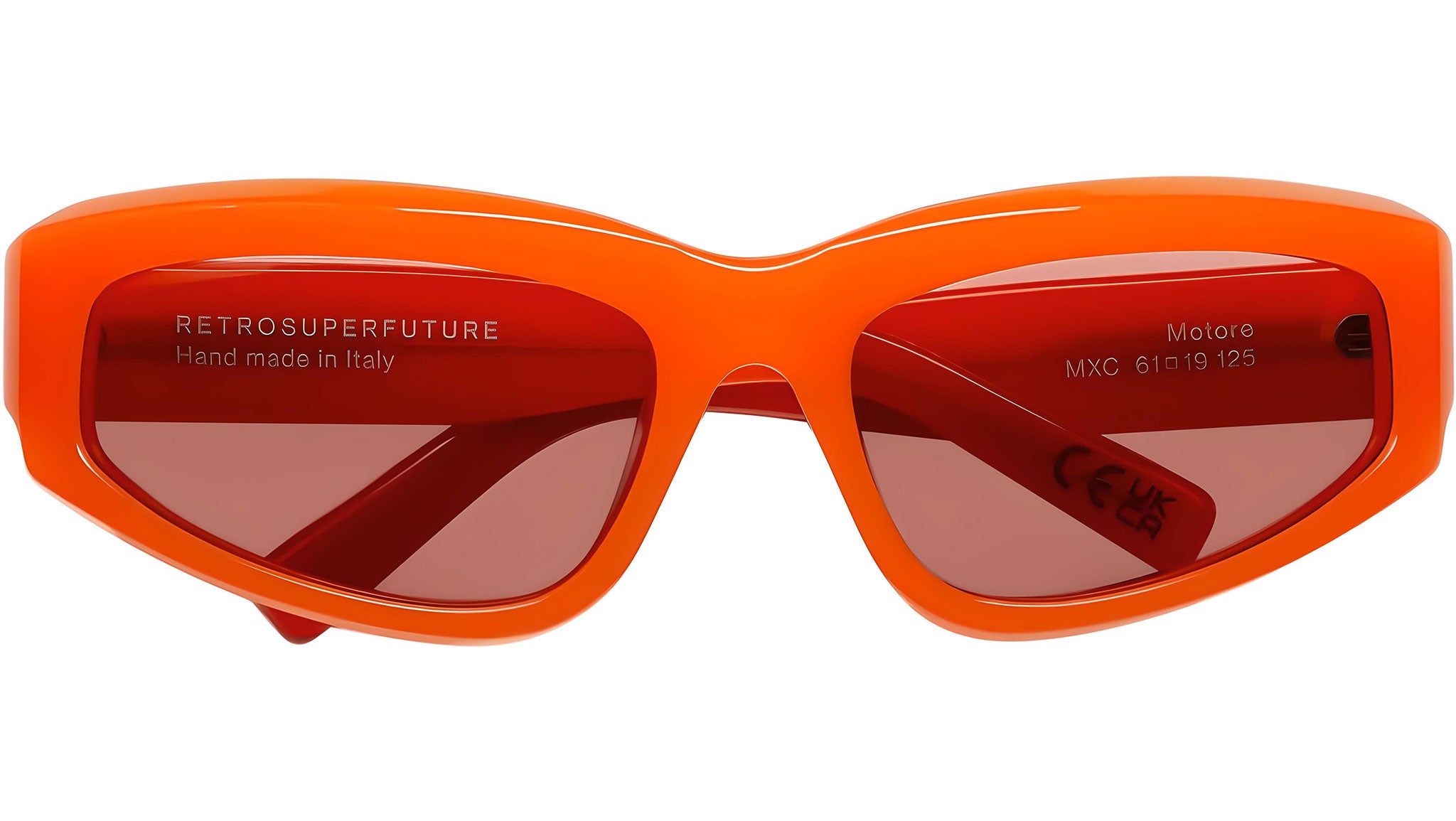 Motore came to this earth with an athletic core, but gradually matured with time and thanks to its evolution this design grew into an elegant and fashion forward piece that boasts a strong confident character. Motore’s sharp lines and low riding frame kept the eyewear’s fast character, while its meticulous acetate carving and refined details gave the piece its distinctive and sophisticated manner. This version is available in a fresh and juicy orange acetate and bordeaux lenses. Sizes: R. Lens Width: 61 mm. Frame Front: Frame Side: 125 mm. Product Code Size R: MXC.