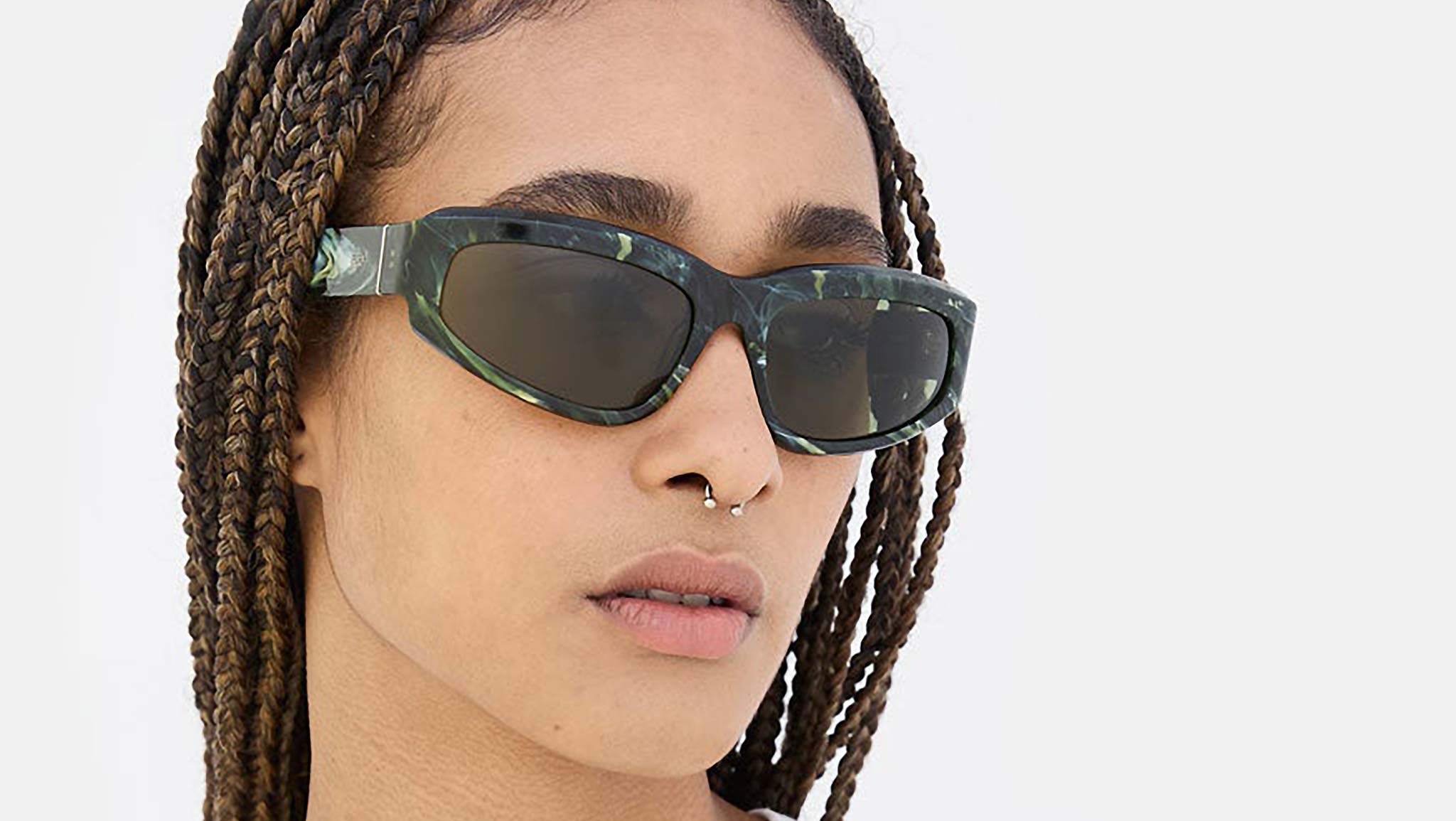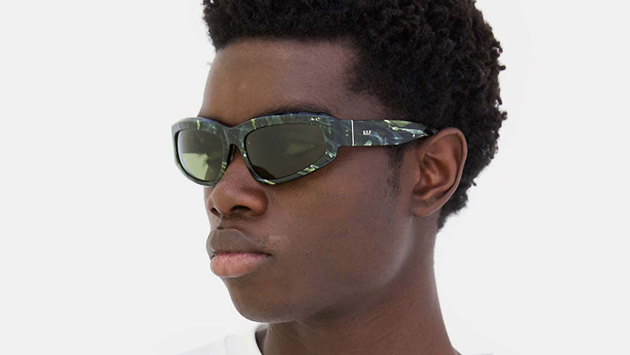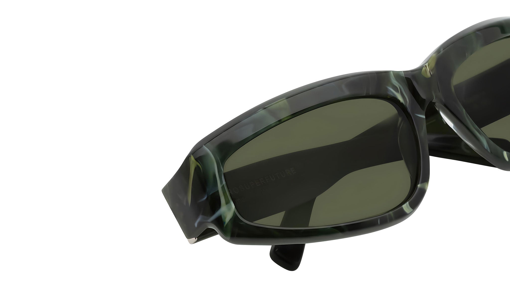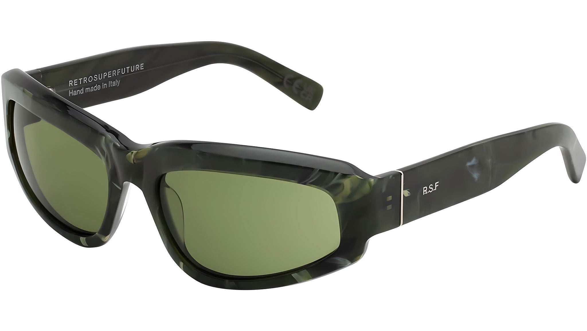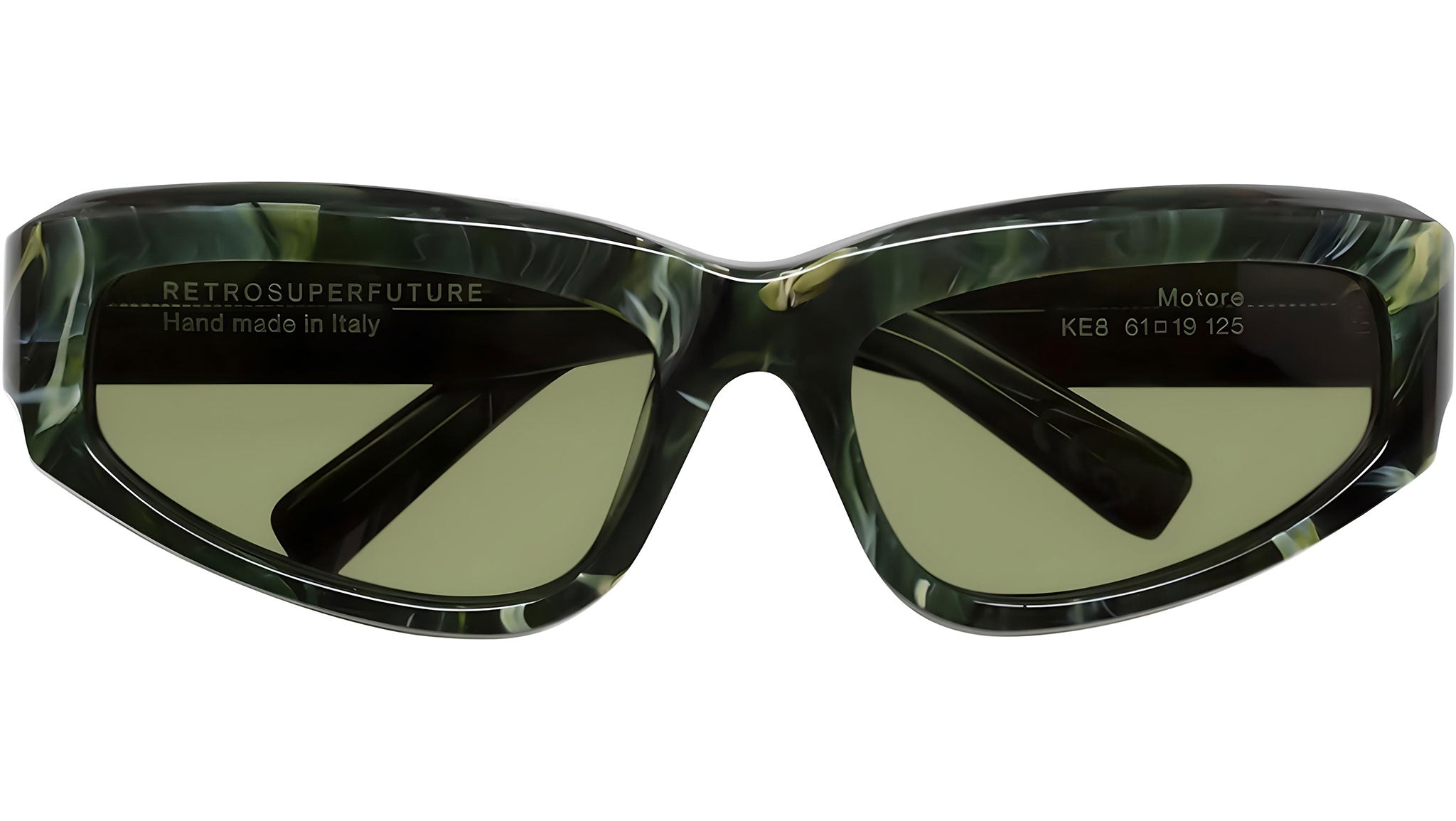 Motore came to this earth with an athletic core, but gradually matured with time and thanks to its evolution this design grew into an elegant and fashion forward piece that boasts a strong confident character. Motore’s sharp lines and low riding frame kept the eyewear’s fast character, while its meticulous acetate carving and refined details gave the piece its distinctive and sophisticated manner. This version is available in a rich green marbled acetate and bottle green lenses. Sizes: R. Lens Width: 61 mm. Frame Front: Frame Side: 125 mm. Product Code Size R: KE8.
