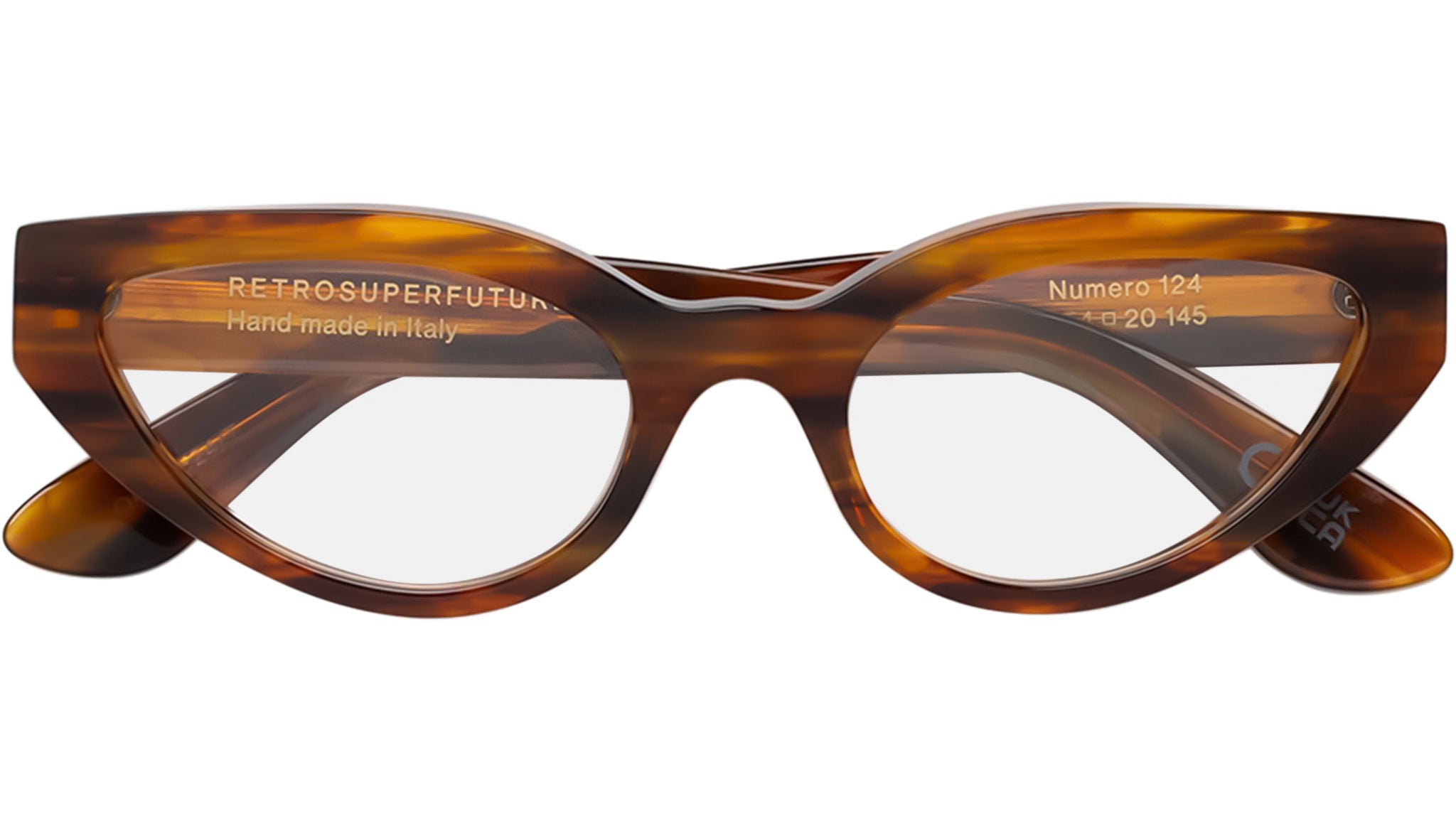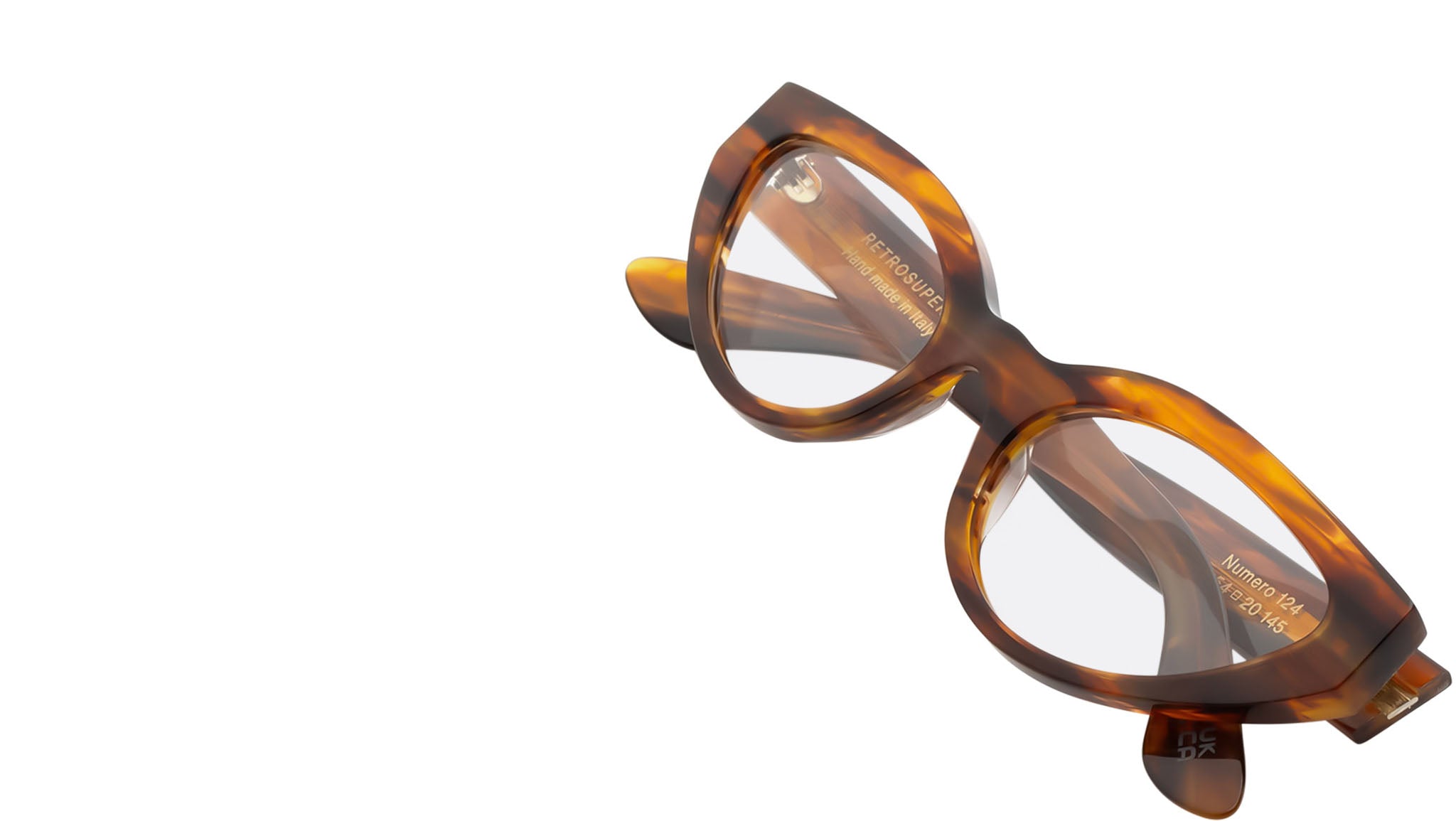 Numero 124 is a sleek yet playful cat-eye frame. Its design plays between modern essential lines and retro-inspired touches, with its clear lenses adding to that sophisticated style, this version of the N124 comes in a unique and rich tortoise shell acetate. The sturdy construction is crafted in a functional way to maintain a lightweight frame, ensuring a comfortable wear throughout the day. Handcrafted in Italy. Sizes: Lens Width: 54 mm. Frame Front: 0 mm. Frame Side: 145 mm.