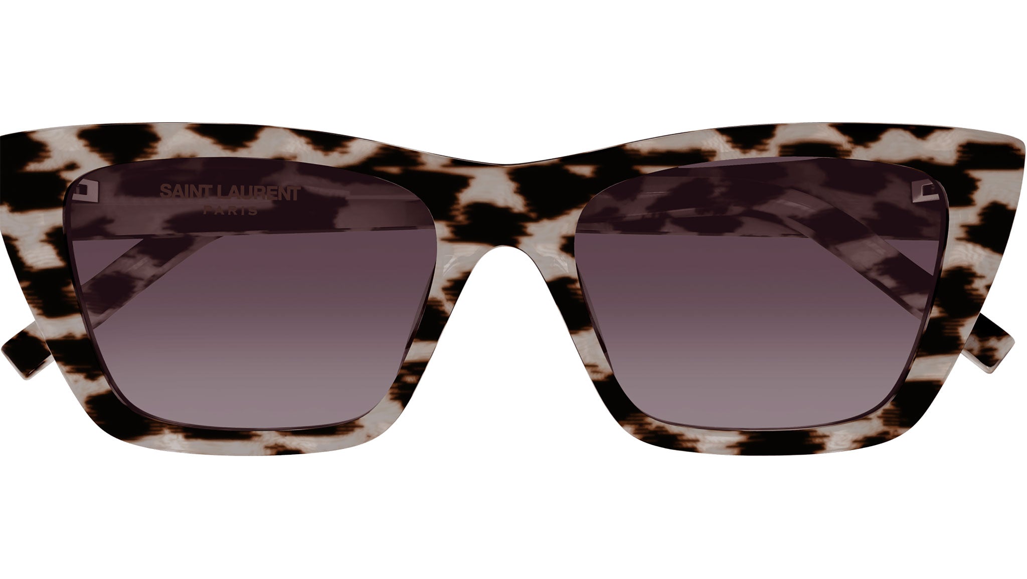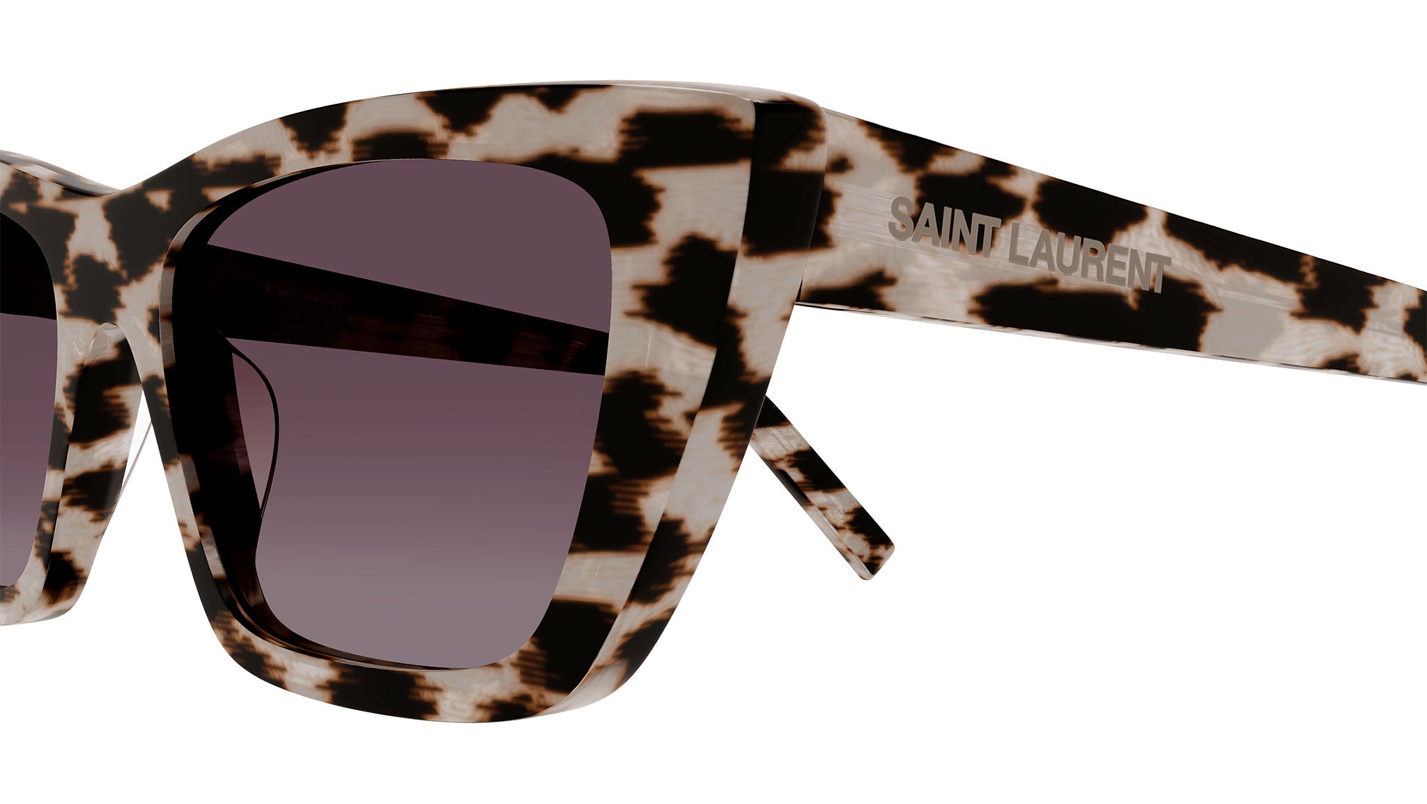 Occhiali da sole Saint Laurent linea New Wave modello SL 276 MICA variante colore 036 avana leopardato lucido con lenti color doppia sfumatura viola e borgogna.