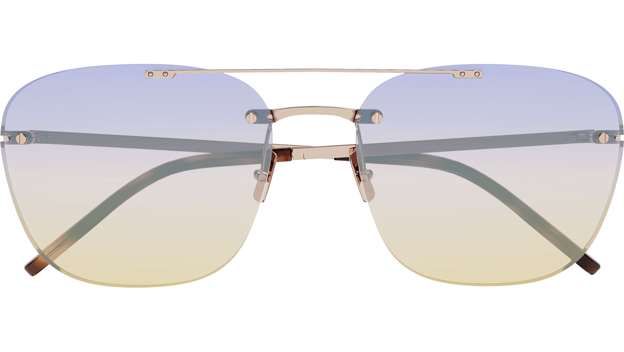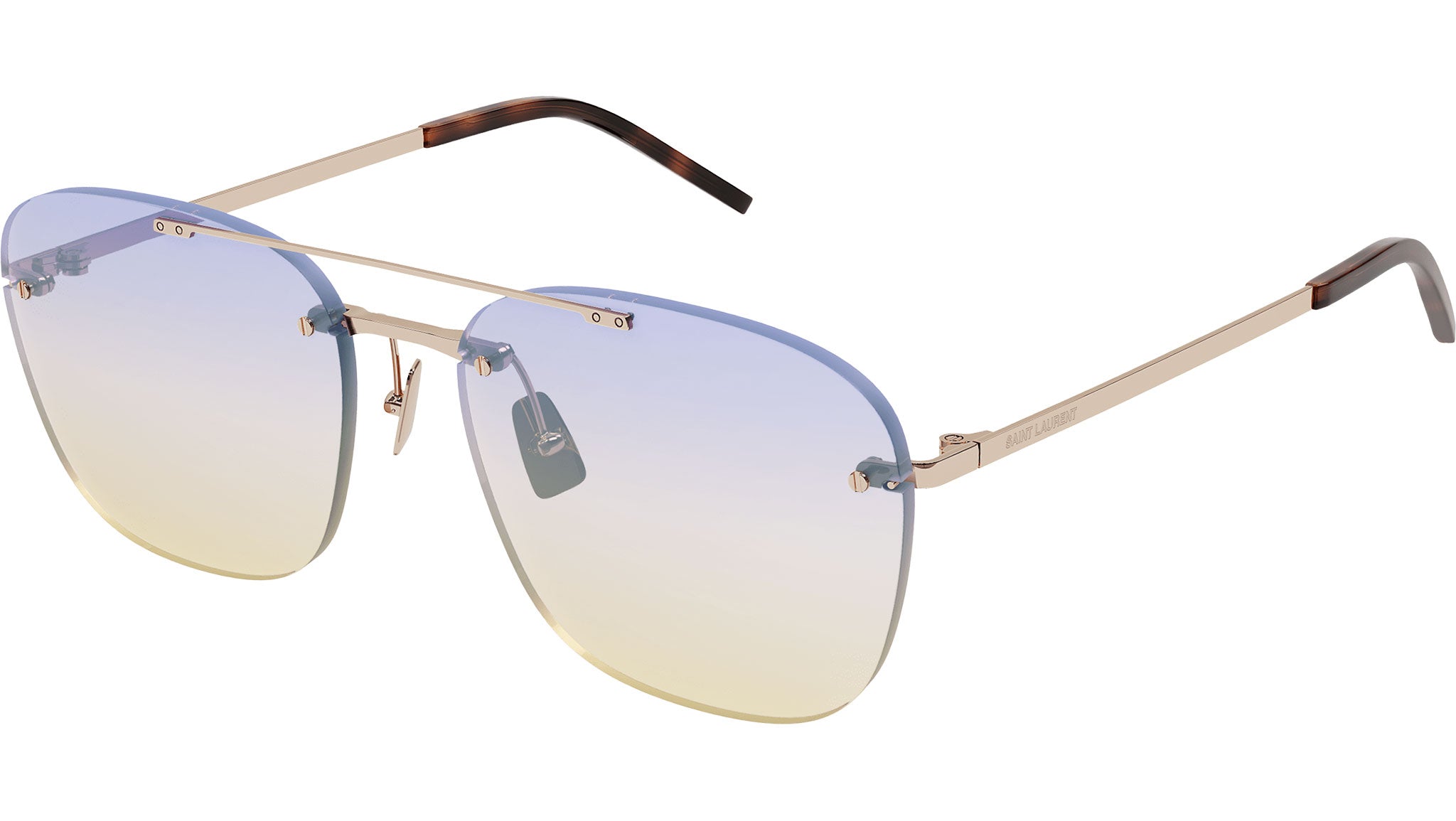 Occhiali da sole Saint Laurent linea Classic modello SL 309 RIMLESS 004, variante colore oro rosso brillante con lenti color doppia sfumatura da lilla a giallo. Saint Laurent Eyewear rappresenta in pieno le attitudini uniche del brand: stile senza tempo coniugato a un moderno concetto di lusso. La collezione YSL di occhiali da sole offre una raffinata selezione di prodotti unici, contraddistinti da una qualità inarrivabile.