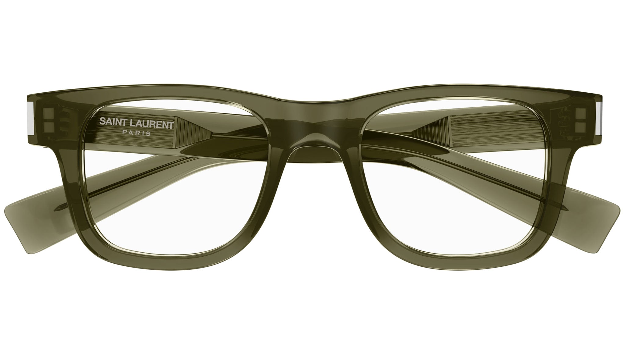Occhiali da vista Saint Laurent modello SL 564 OPT linea New Wave codice colore 007 verde trasparente lucido in acetato forma rectangle con aste color verde.